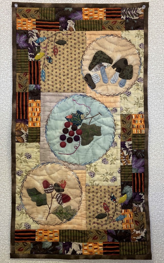 たくさんの布を合わせて、実りの秋を表現したタペストリーです。丸窓の中には、ヤマブドウ、キノコ、ドングリをアップリケ。窓の周囲には刺しゅうを施します。 ●サイズ:縦65×横35cm ●キット内容:表布、裏布、刺しゅう糸、包みボタン、作り方説明書 ☆キルト芯は含まれません。