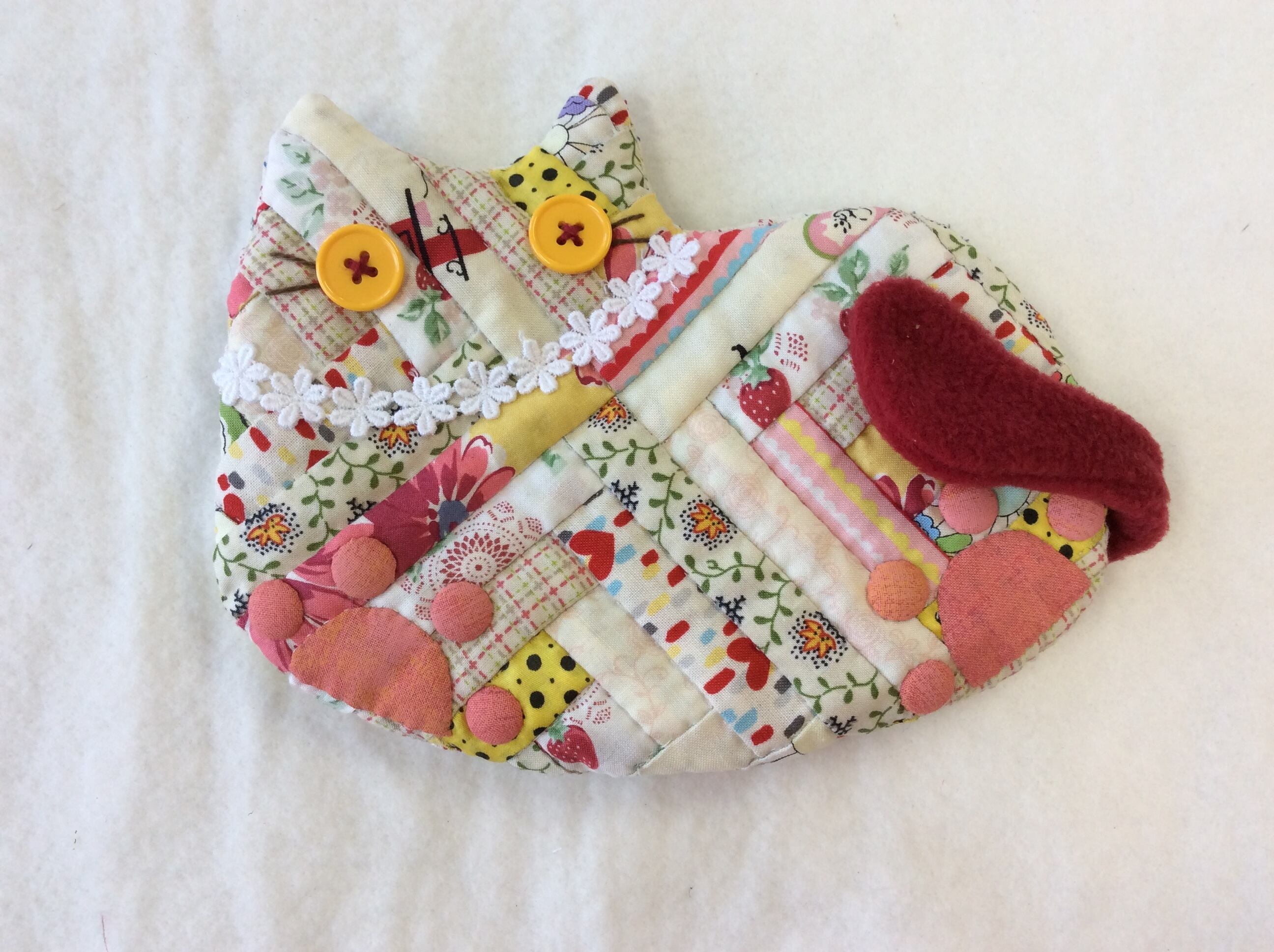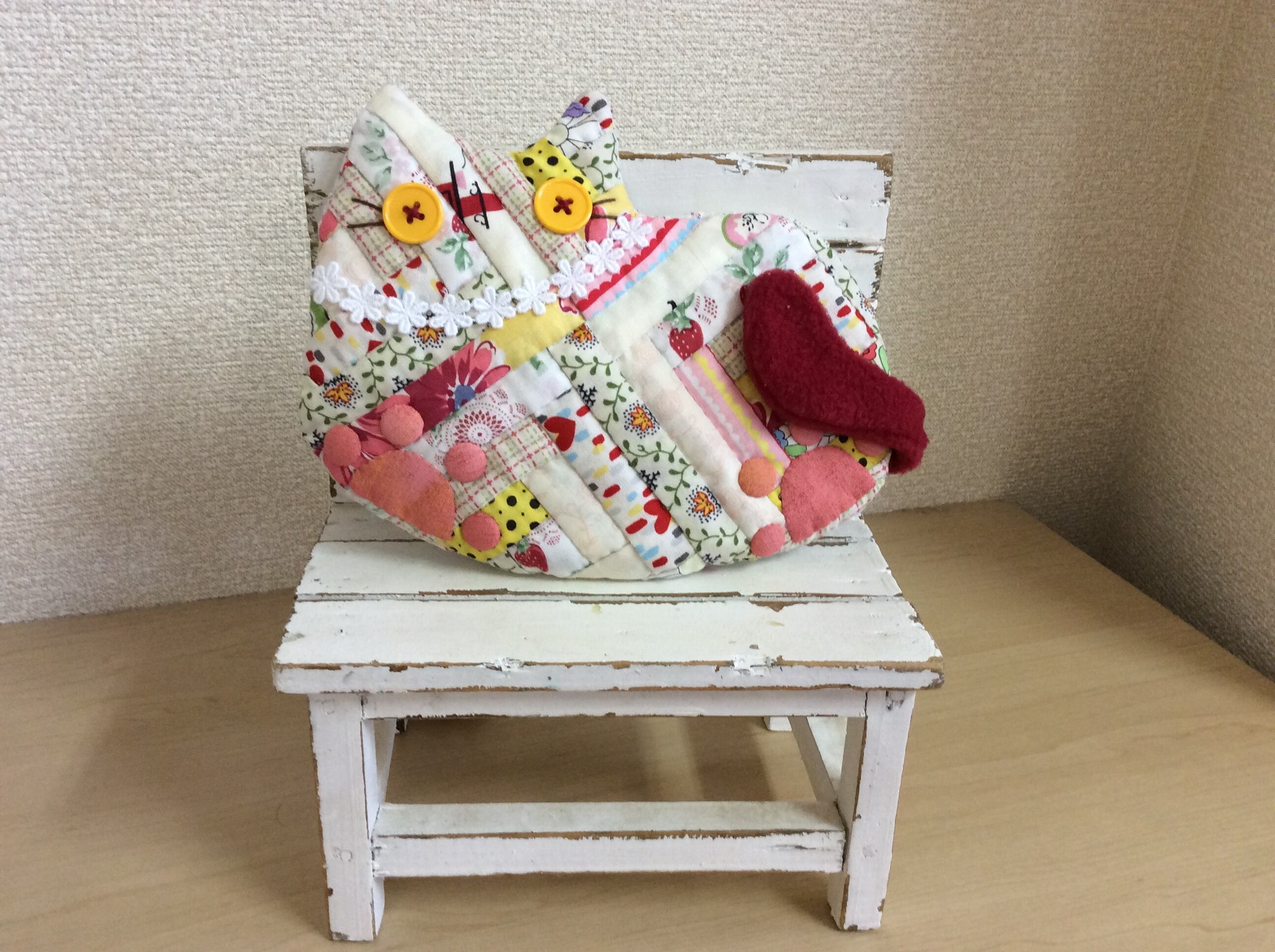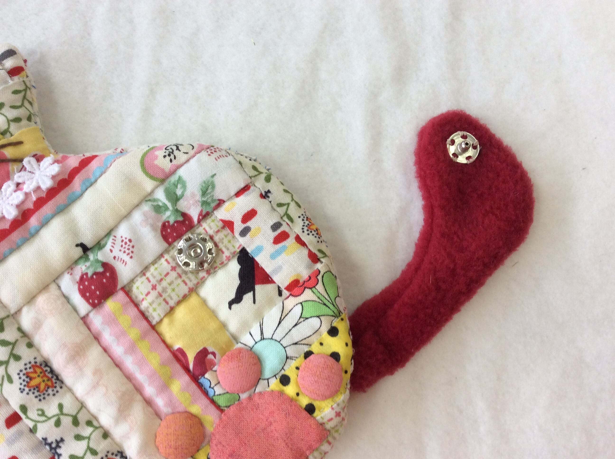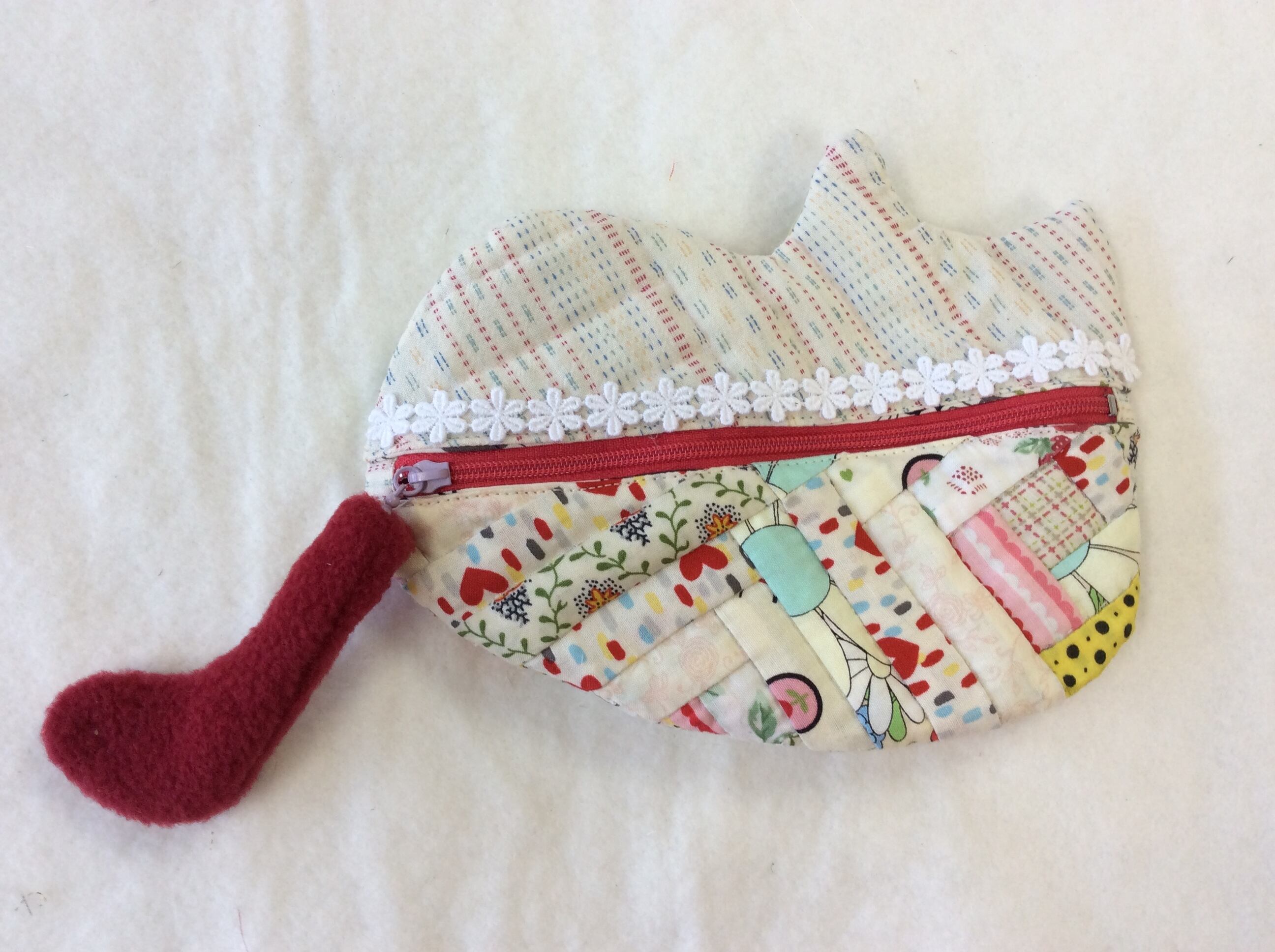 スクラップ布で作るログキャビンのマチなしポーチ。ファスナーポケットの引き手になっているしっぽは、前側にまわしてスナップで留められます。