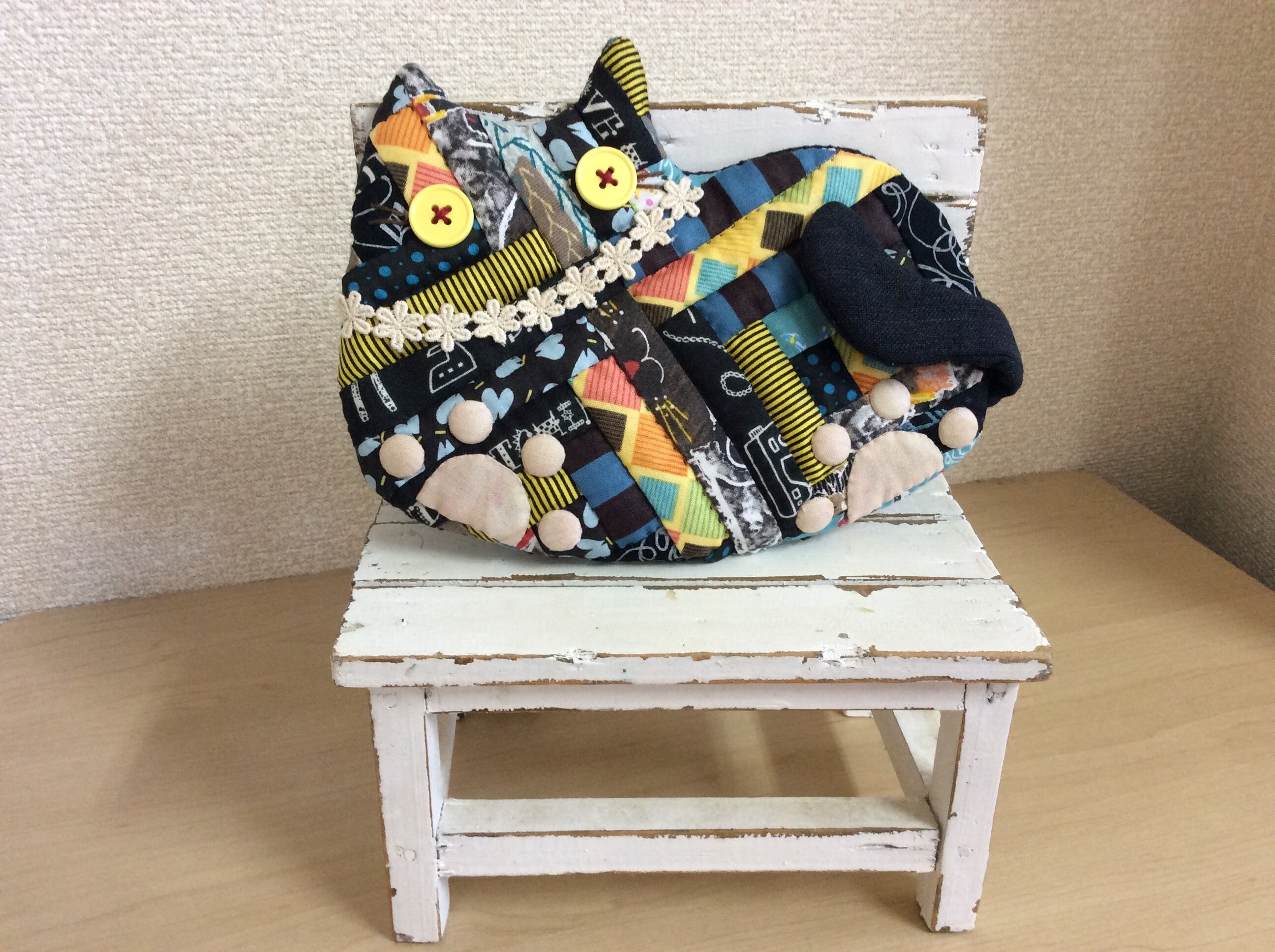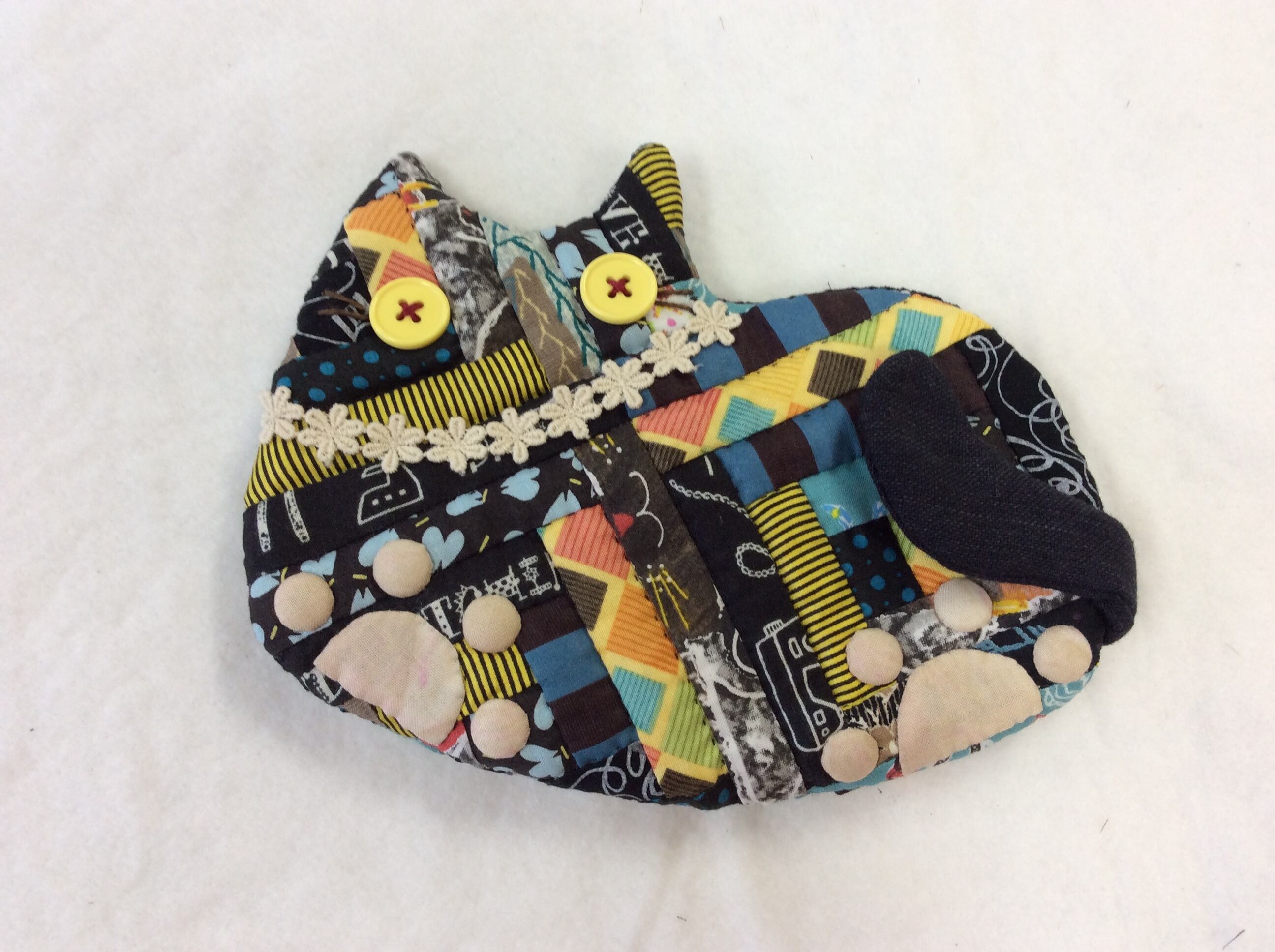 スクラップ布で作るログキャビンのマチなしポーチ。ファスナーポケットの引き手になっているしっぽは、前側にまわしてスナップで留められます。