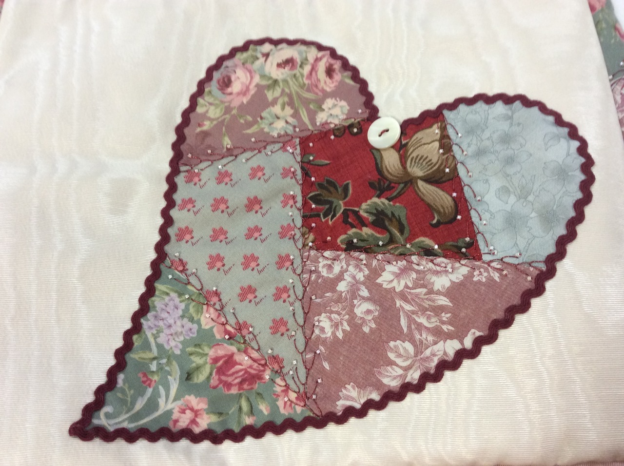 じゃばらテープに縁取られたクレイジーキルトのハートが印象的。マチの部分も簡単なクレイジーキルトです。土台布にはUSAのモアレを使用し、キルティングを省きます。台形のウッドハンドルを含むセットです。