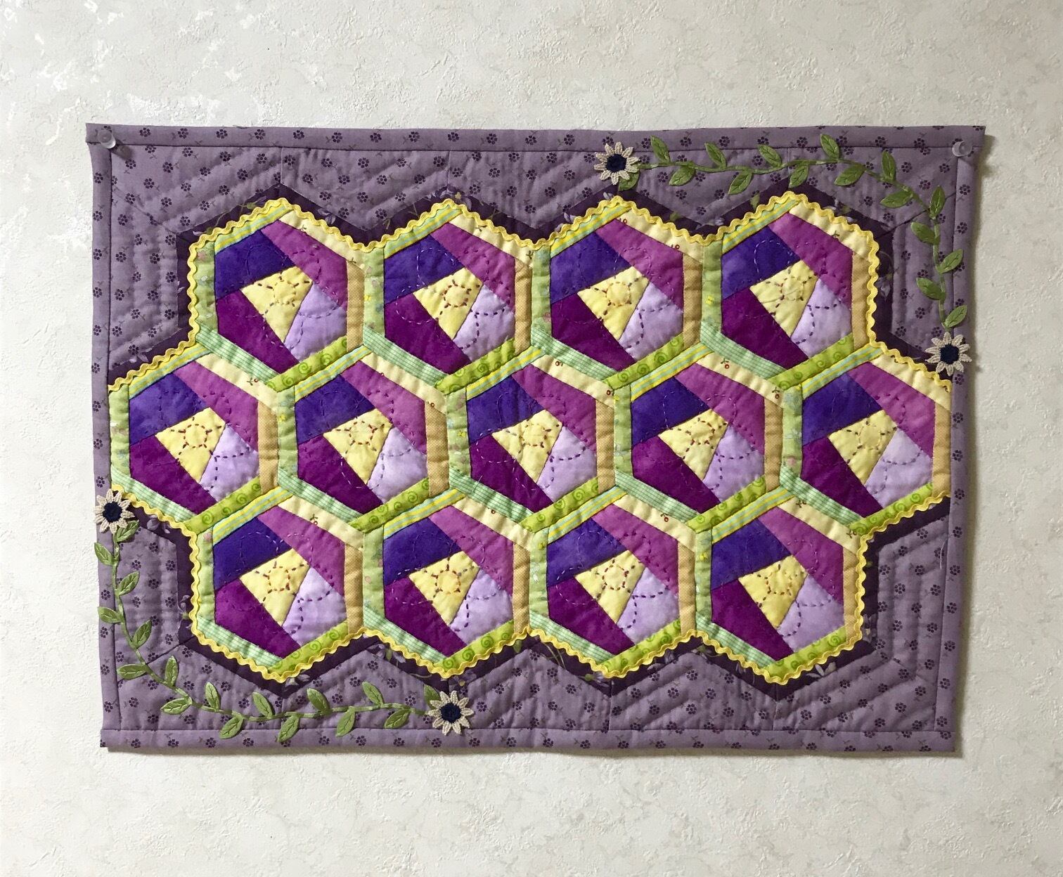 ムラ染めのクレイジーキルトにプリント布を合わせたヘキサゴンで、スミレを表現したタペストリー。美しいコントラストと調和を兼ね備えたモダンな配色です。