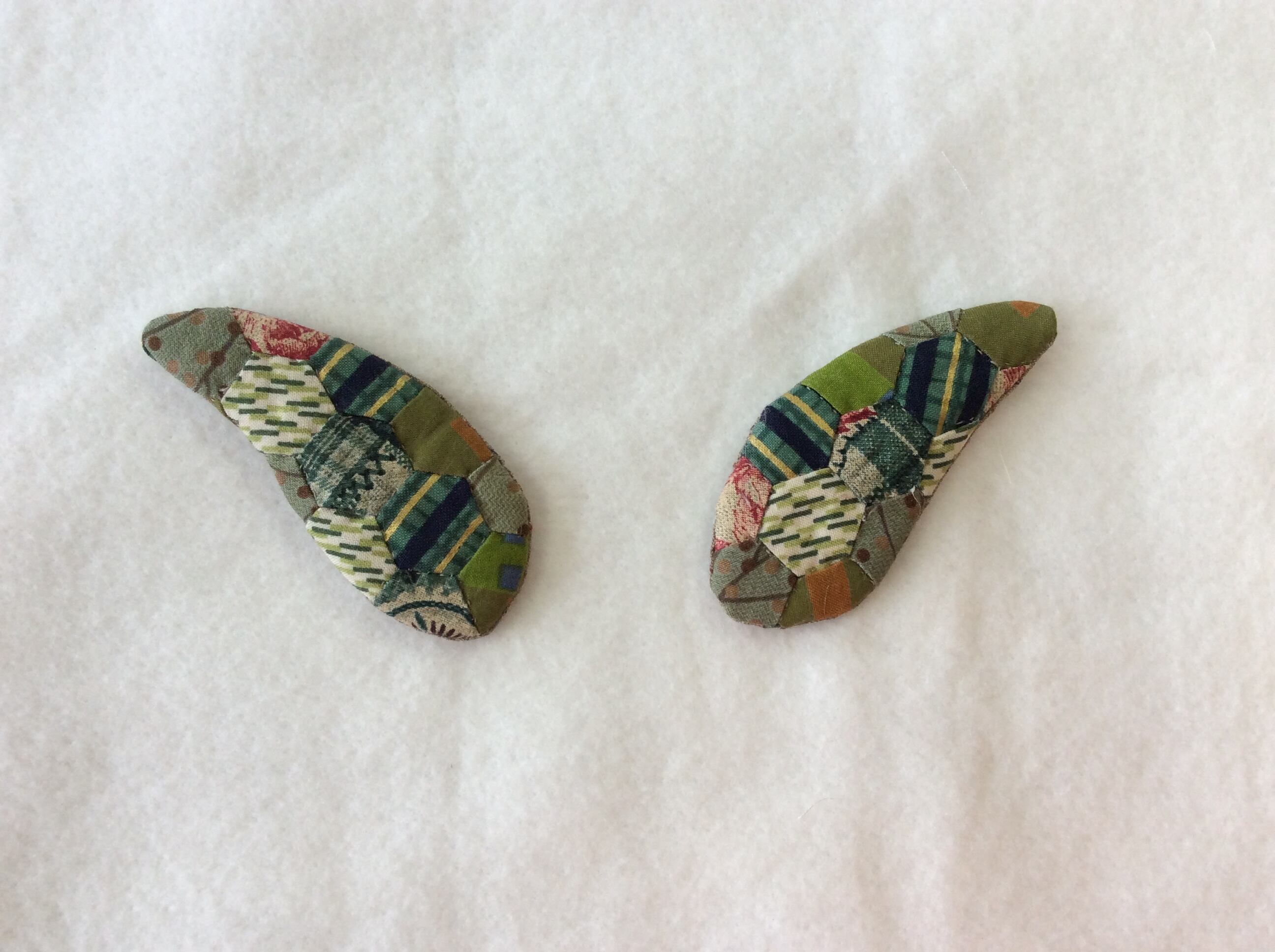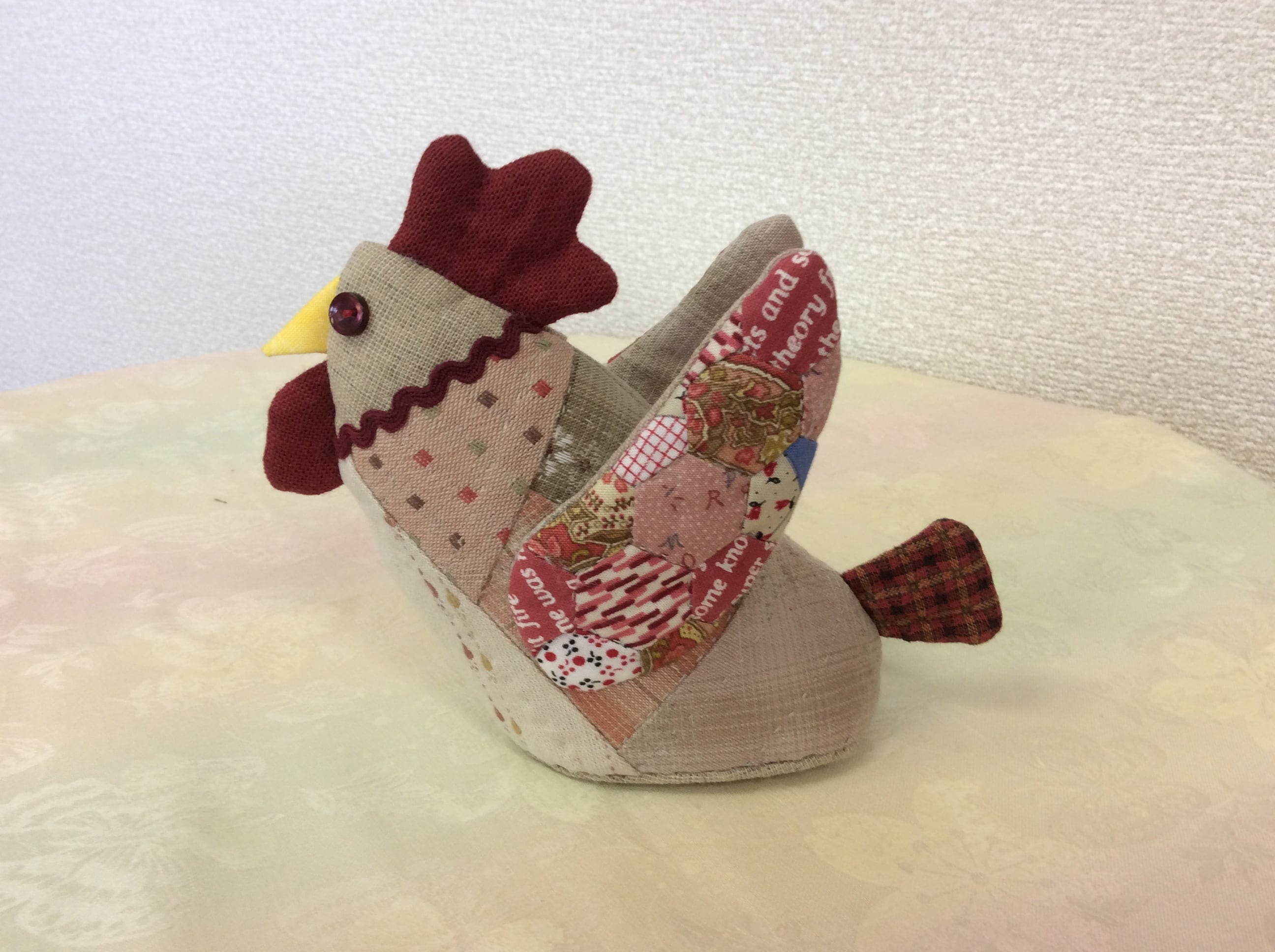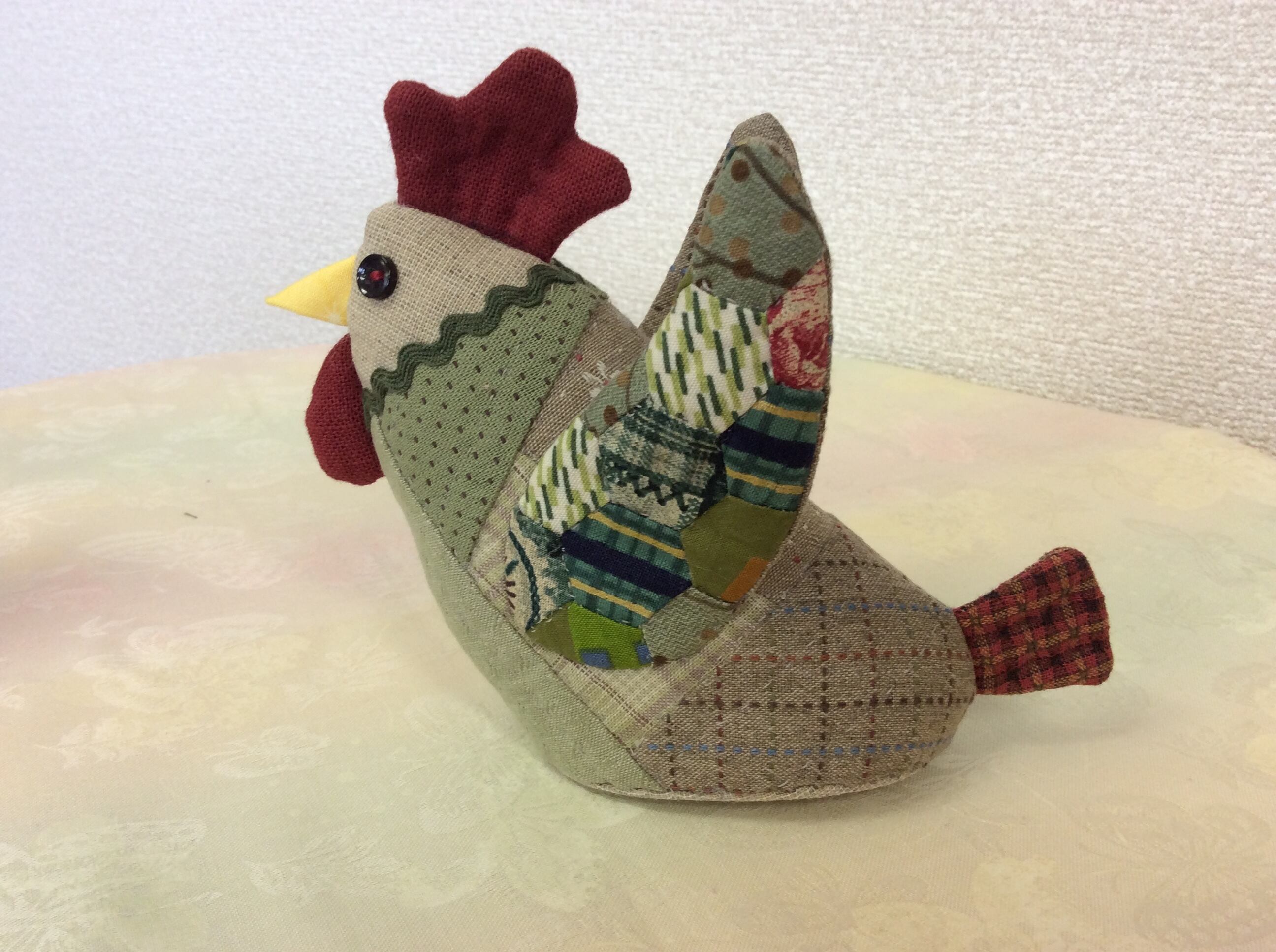 羽部分はヘキサゴンのピースワークで。飾る季節や場所を選ばない、落ち着いた可愛らしさがあります。材料は2体分入っています。