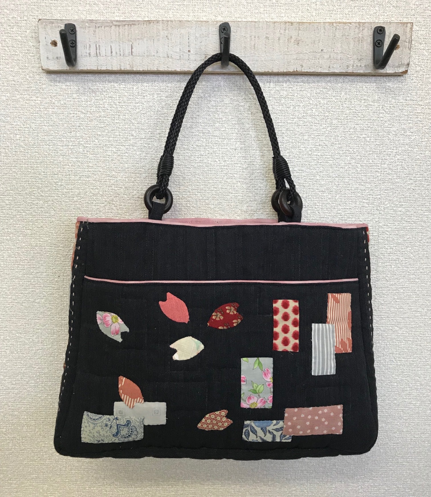 華やかなピースワークと花びらのアップリケが春爛漫の雰囲気。和洋装どちらにも合います。後ろ側にはアップリケした大きなポケットを付けます。