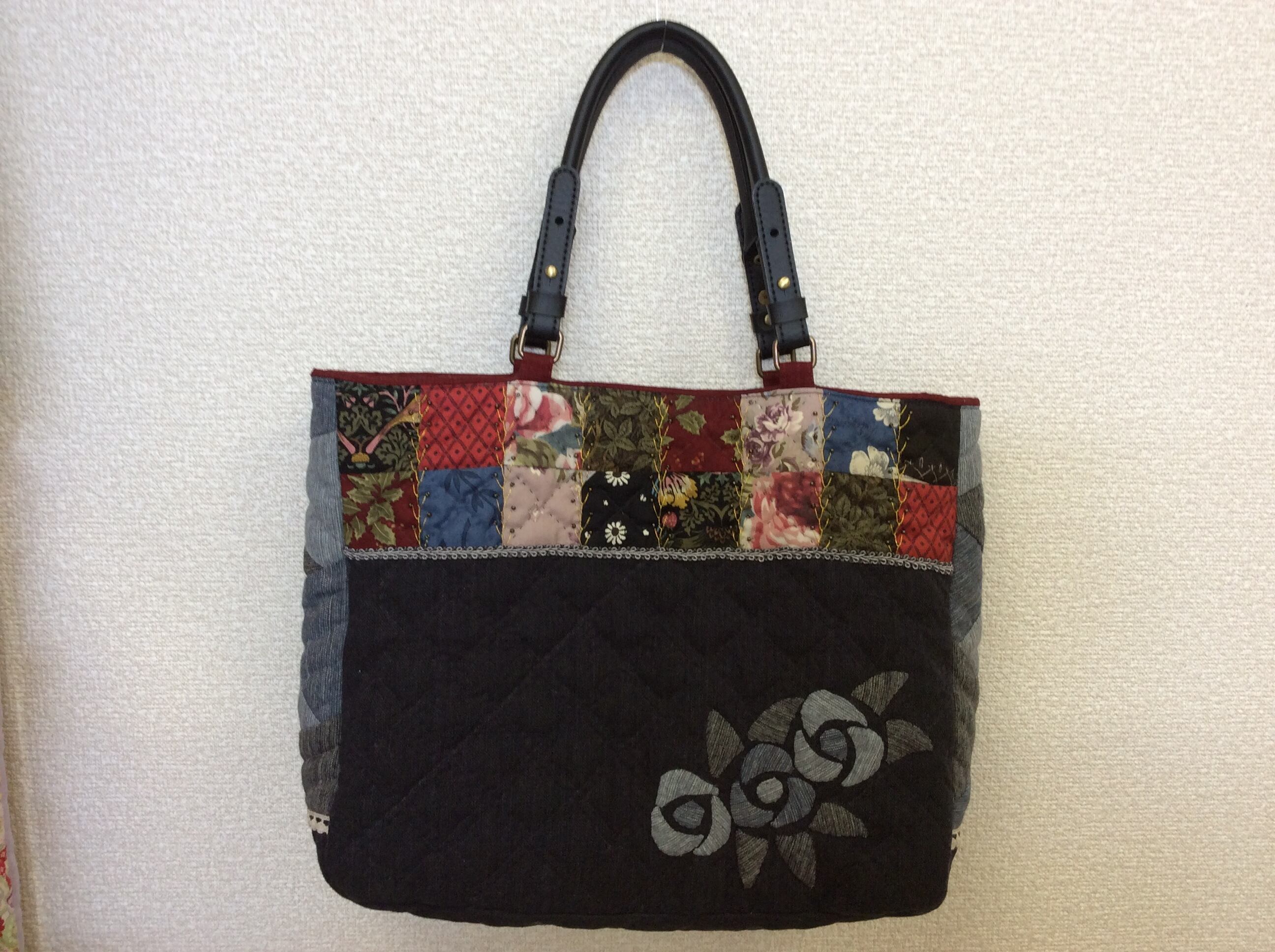 シックなベースに花柄のピースワークを合わせた、手頃なサイズの普段使いバッグです。ブレードやビーズ、ステッチで飾ります。花の部分はアップリケ。セットには持ち手が含まれます。