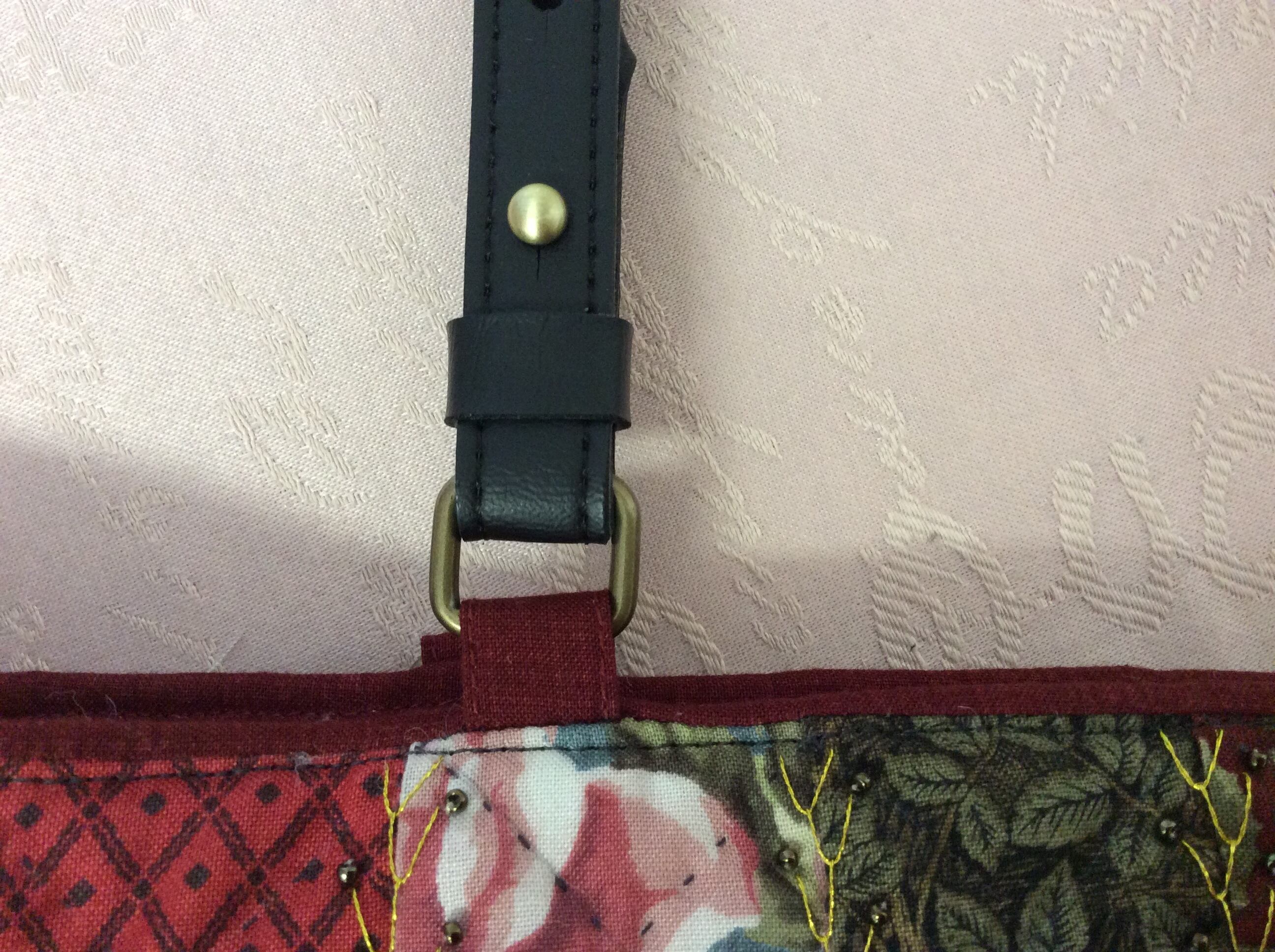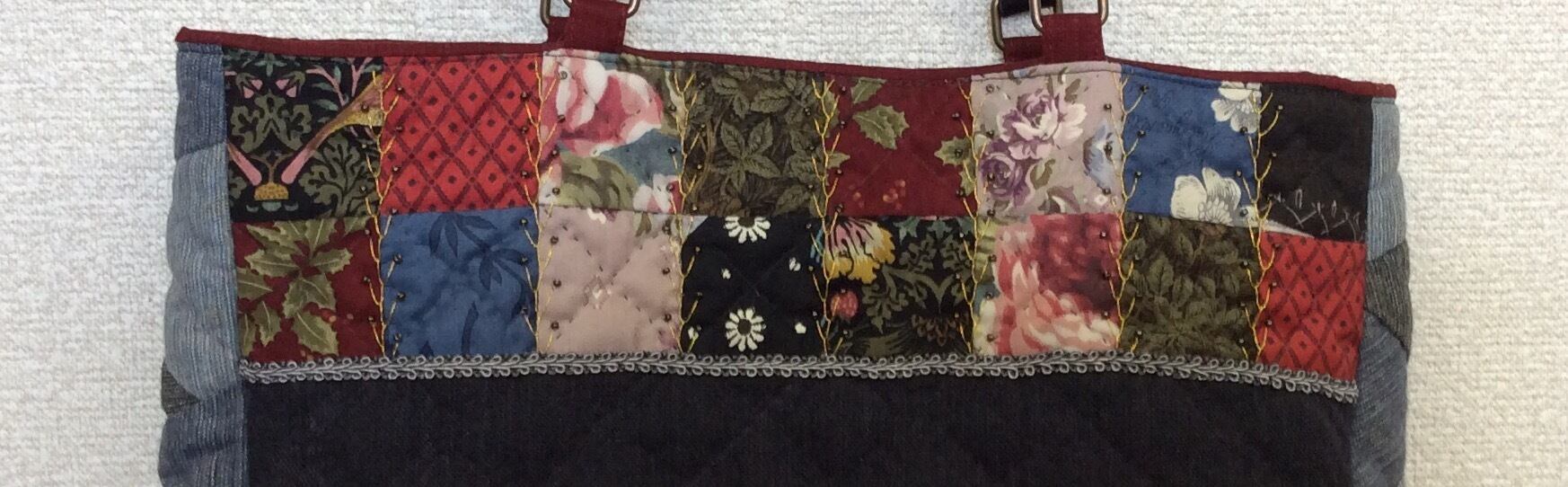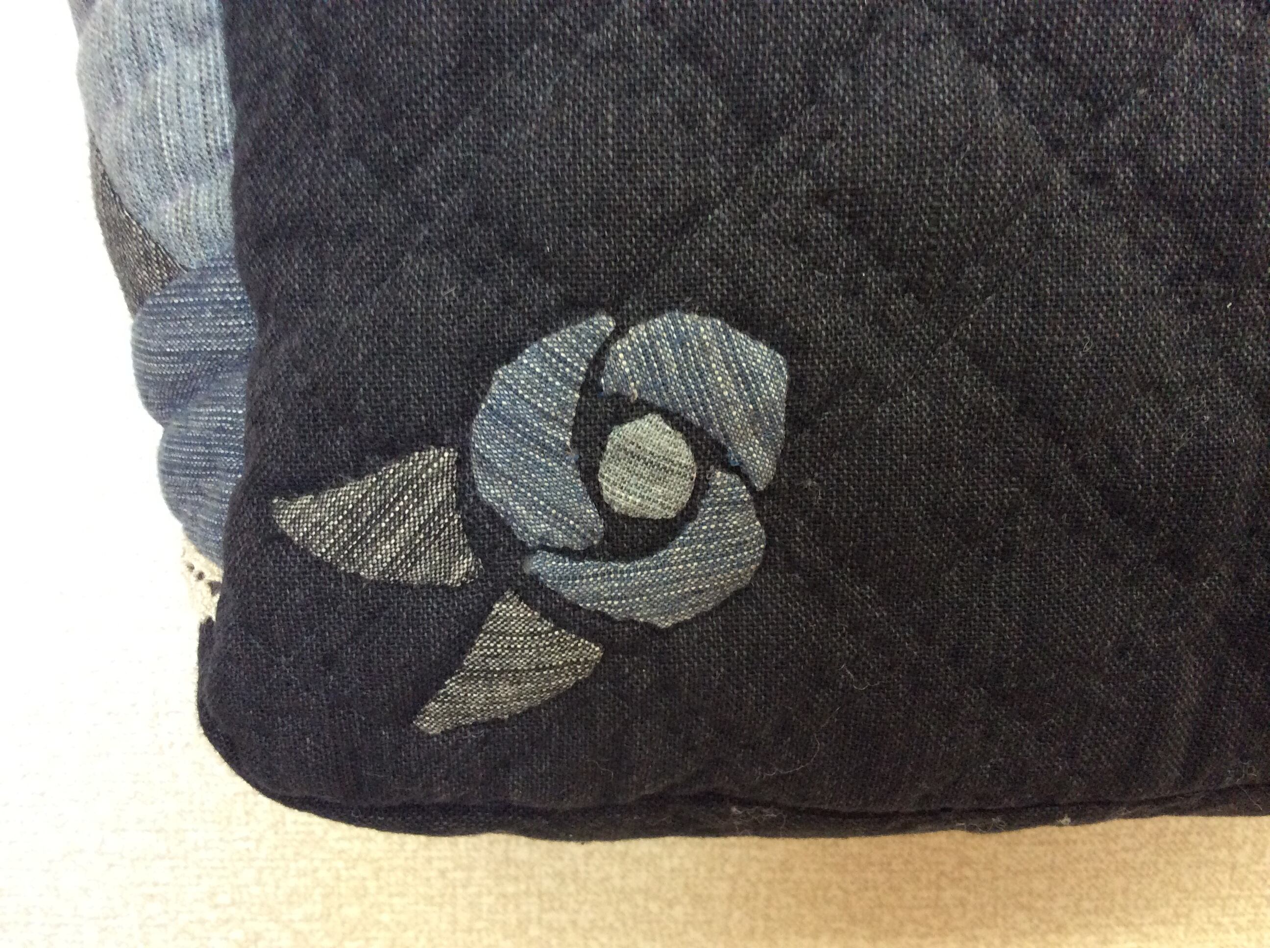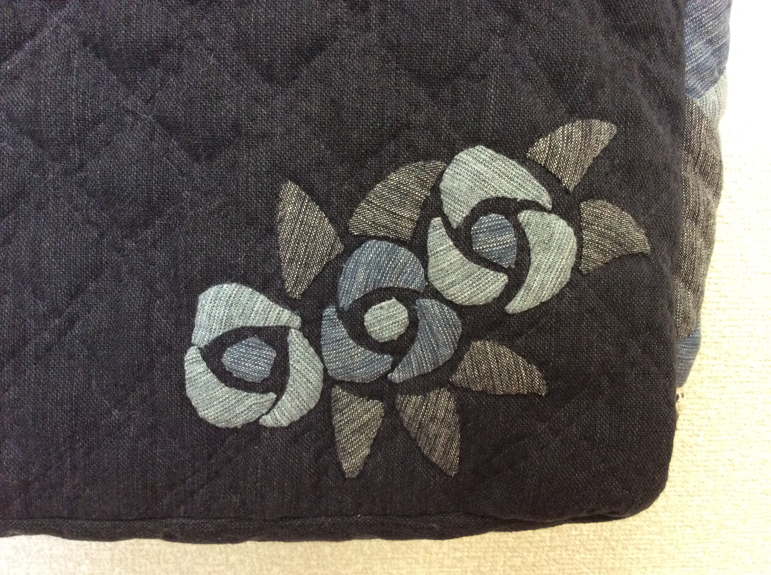 シックなベースに花柄のピースワークを合わせた、手頃なサイズの普段使いバッグです。ブレードやビーズ、ステッチで飾ります。花の部分はアップリケ。
