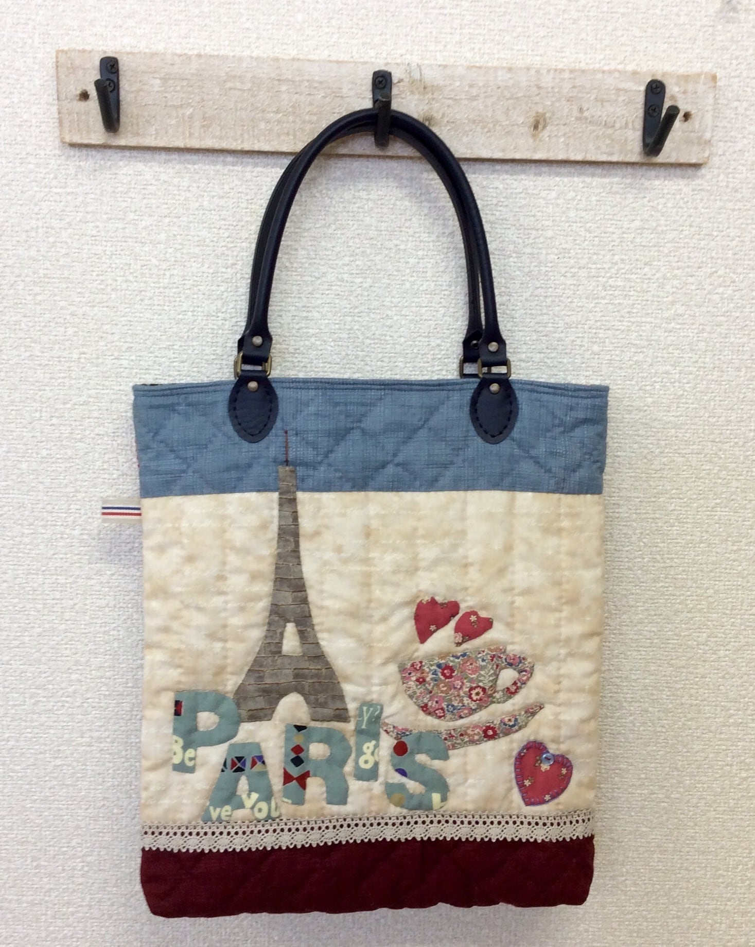 パリをイメージしたトリコロールカラーのトートバッグです。A4サイズが入る大きさ。大きめのアップリケで作りやすいデザインです。後ろ側はヘキサゴンのピースワークになっています。セットには持ち手が含まれます。