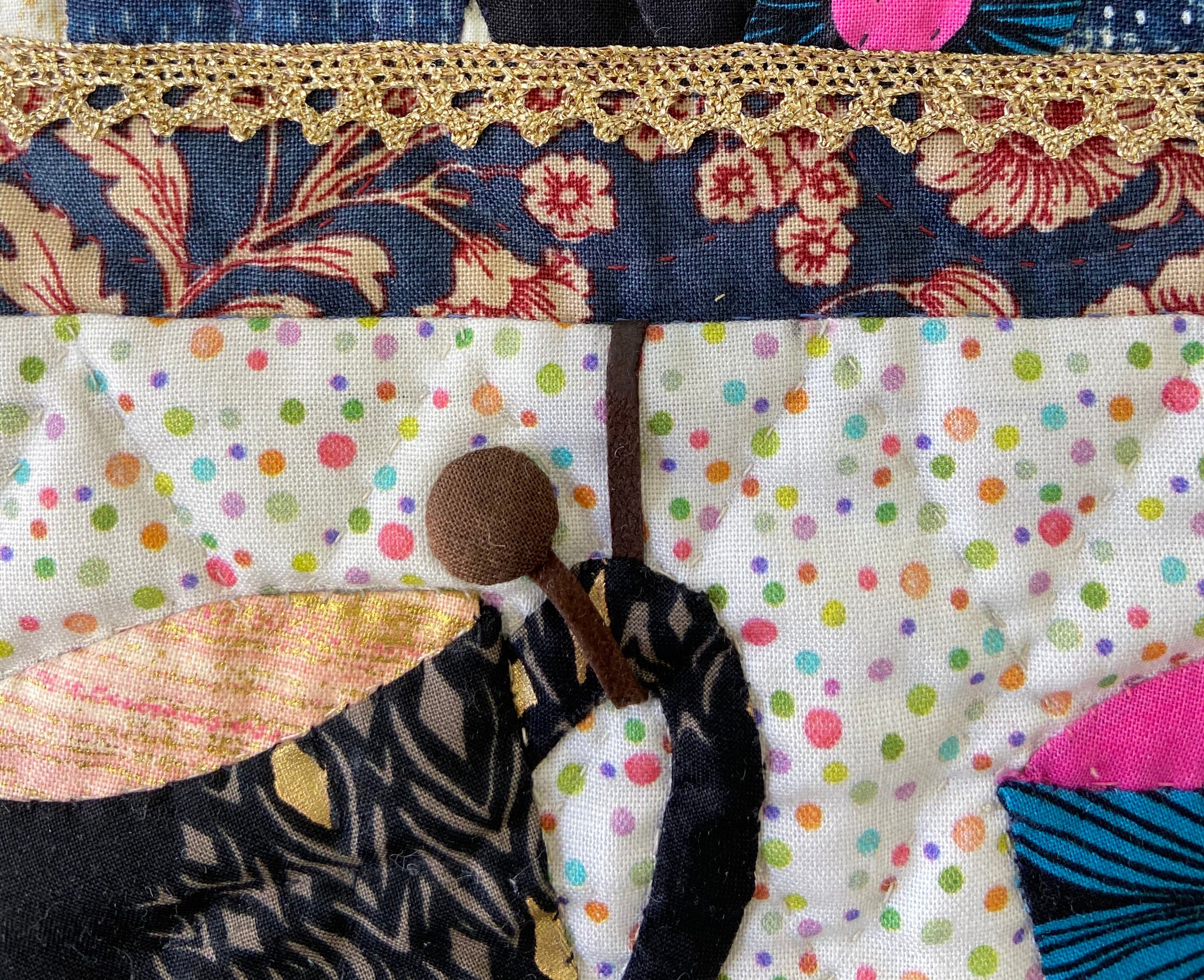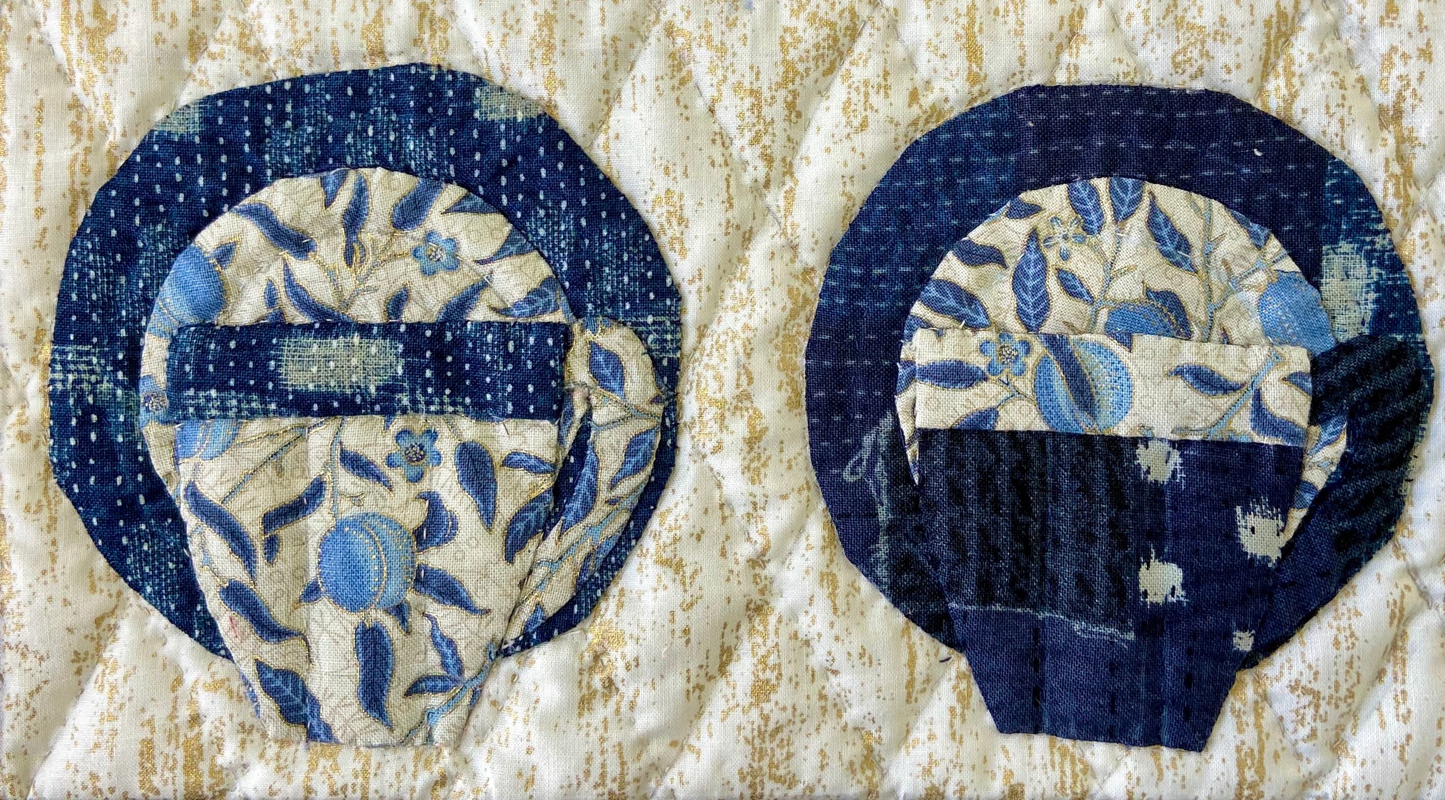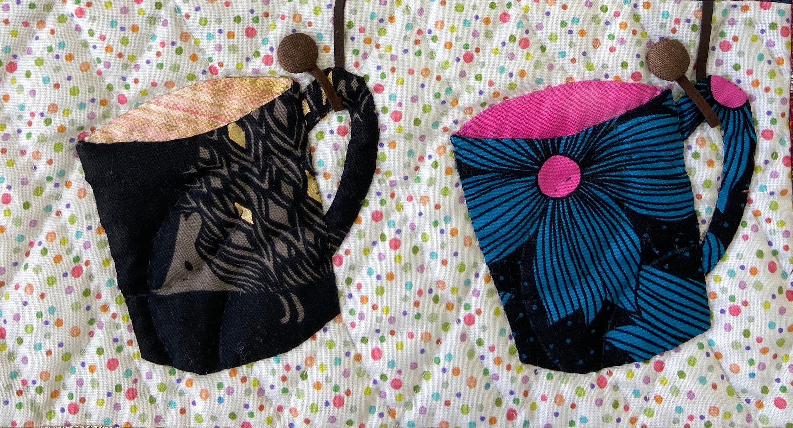 棚からカップを選んでティータイム。そんなゆったりした時間をタペストリーにしました。カップのピースワークにはモダンプリントを使用しています。