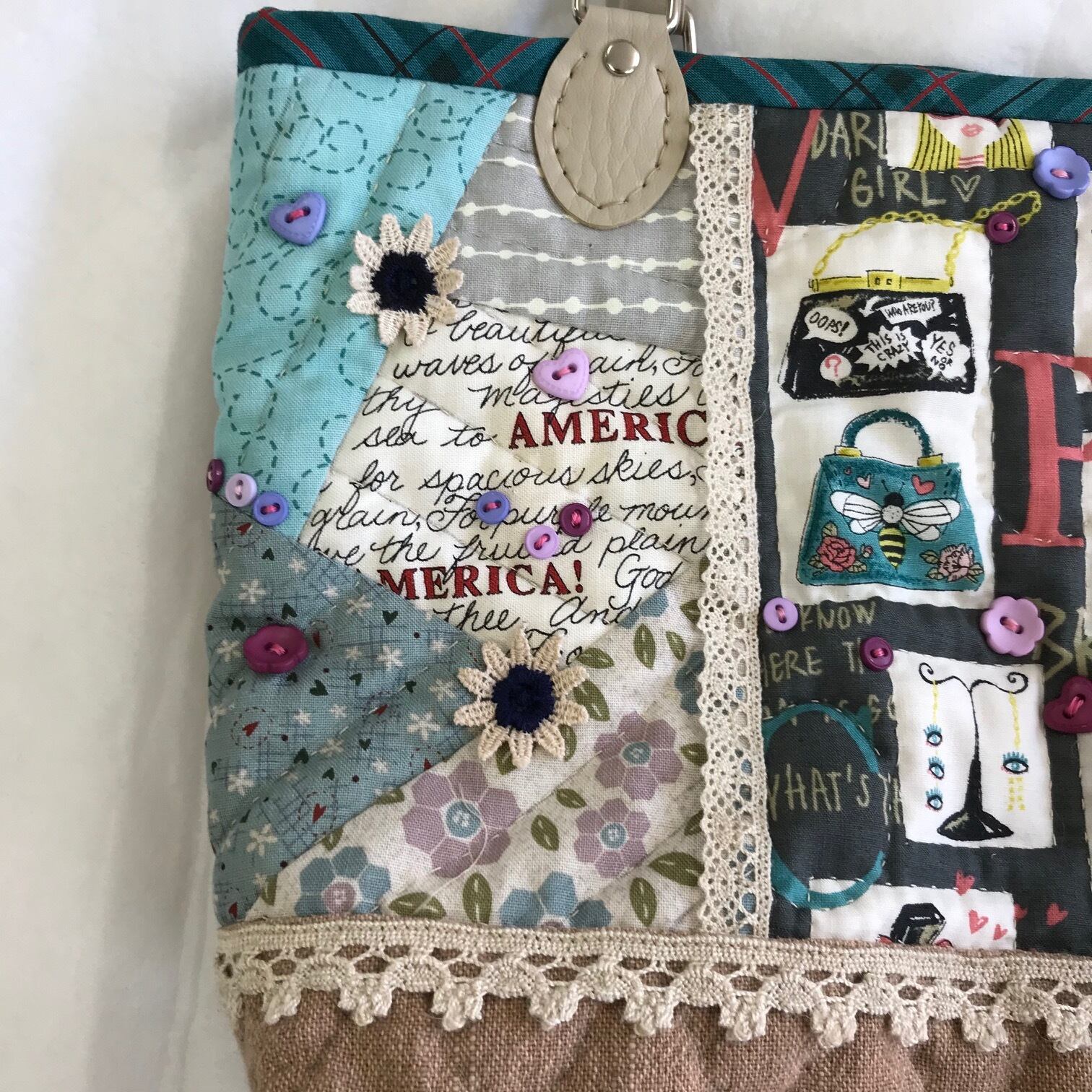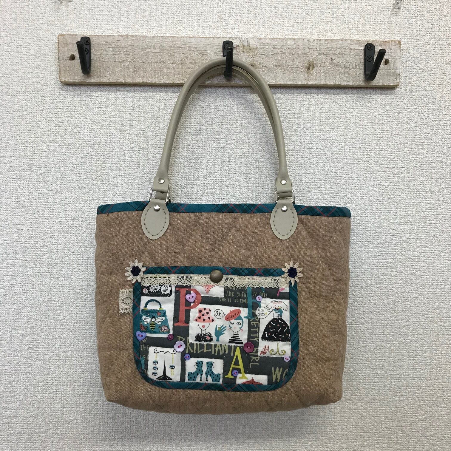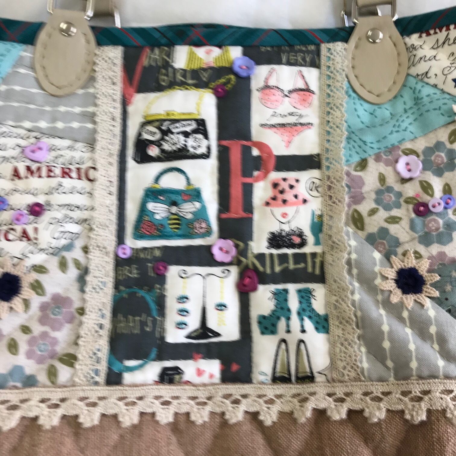 靴やバッグなど、おしゃれなアイテムをプリントした布に、クレイジーキルト風のパッチワークを合わせました。ボタンやレースを飾って、にぎやかな仕上がりに。後ろにはプリント柄を生かした大きなポケットを付けます。セットには持ち手が含まれます。