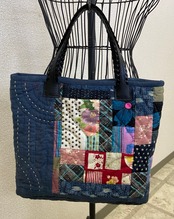 和洋どちらの装いにも合う、華やかなバッグです。藍色のベースに赤やピンクを交えたシンプルな長方形をピースワークしました。セットには持ち手が含まれます。