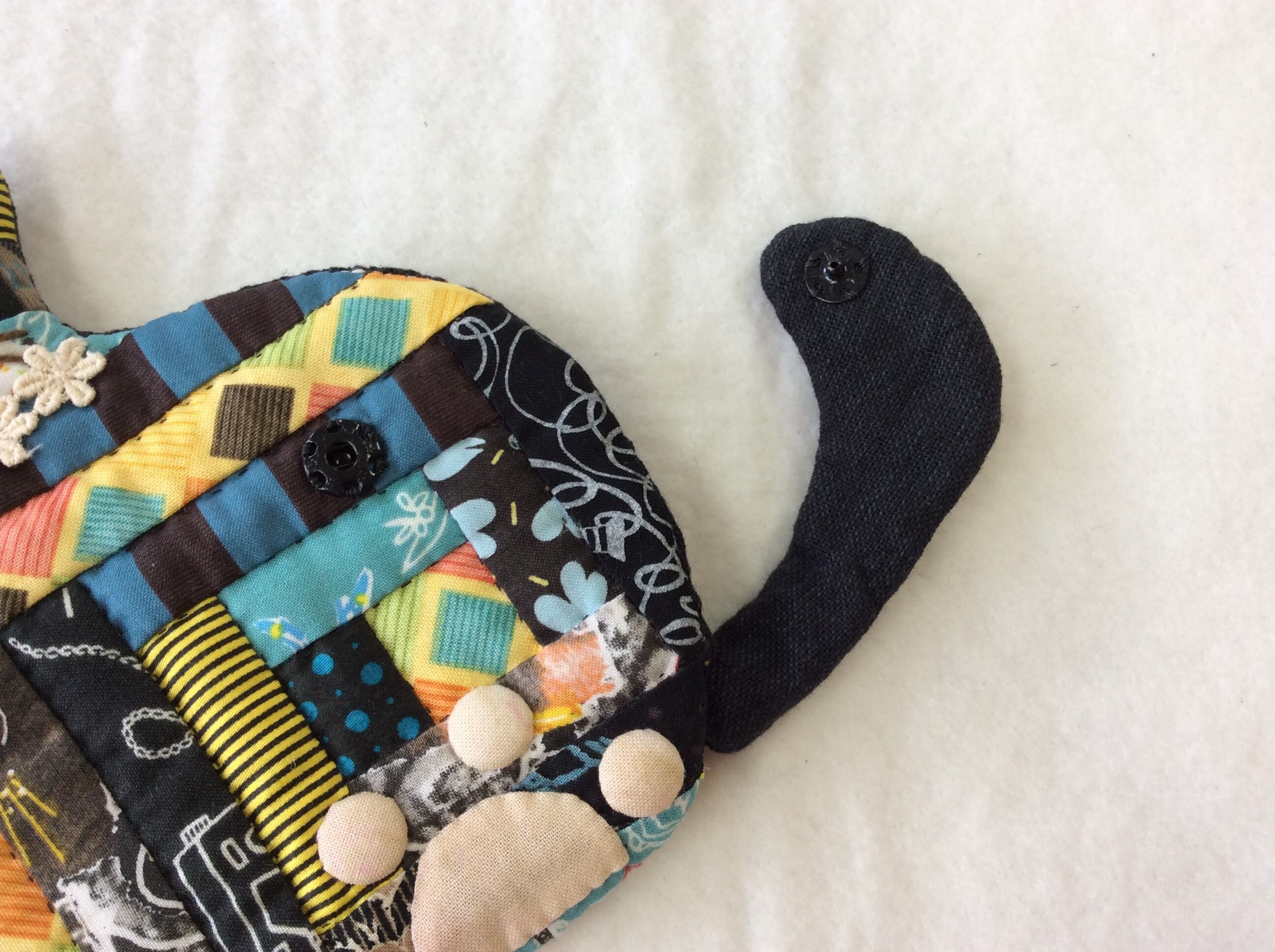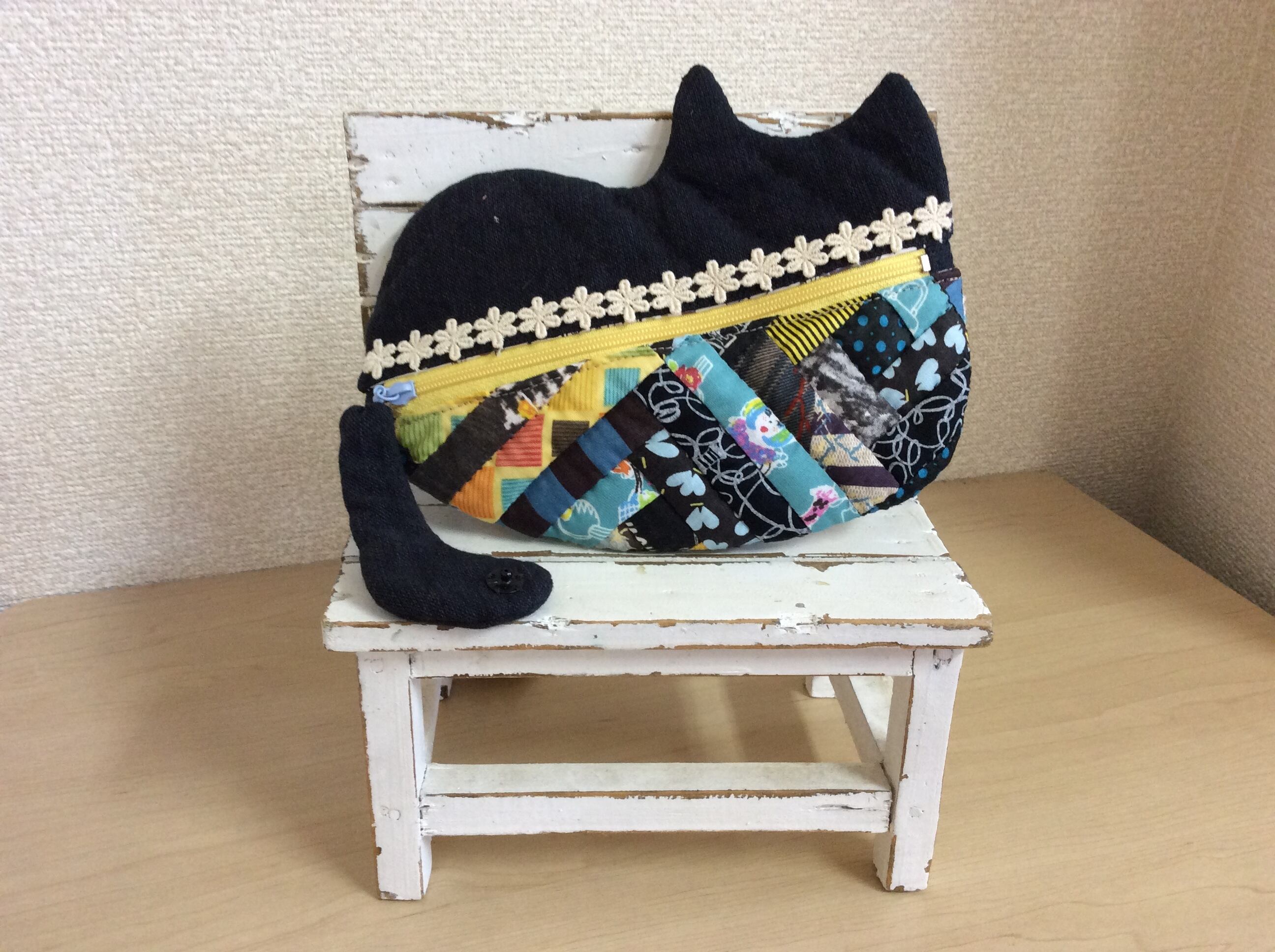スクラップ布で作るログキャビンのマチなしポーチ。ファスナーポケットの引き手になっているしっぽは、前側にまわしてスナップで留められます。
