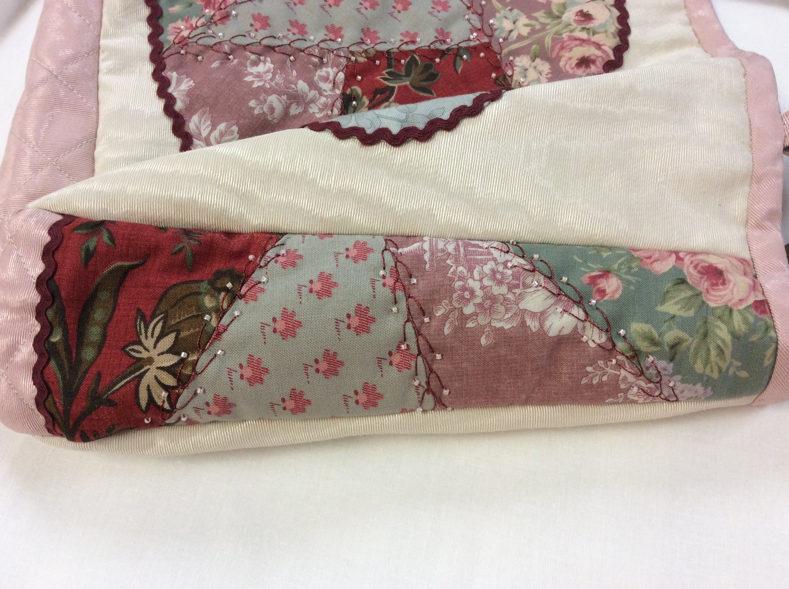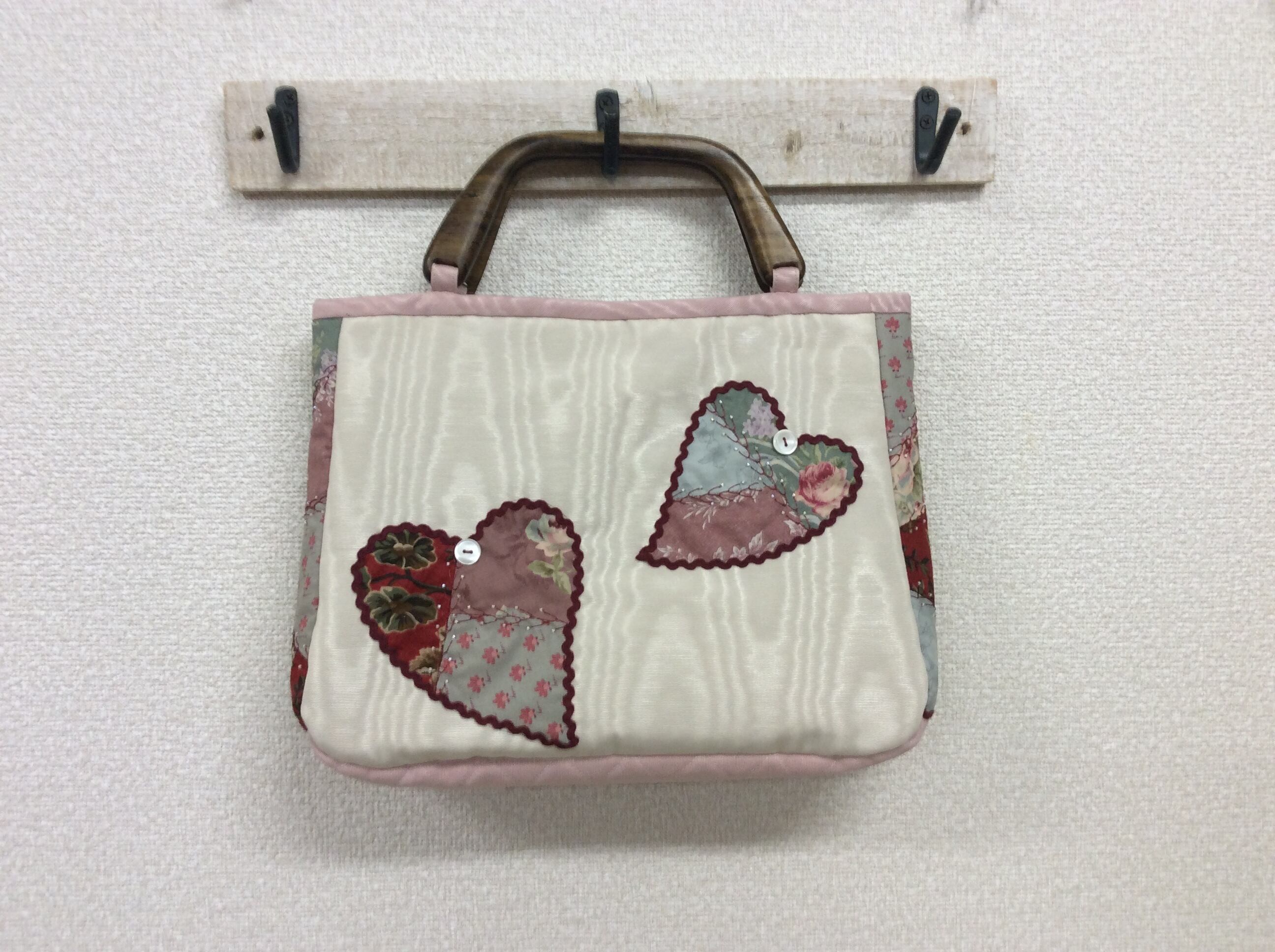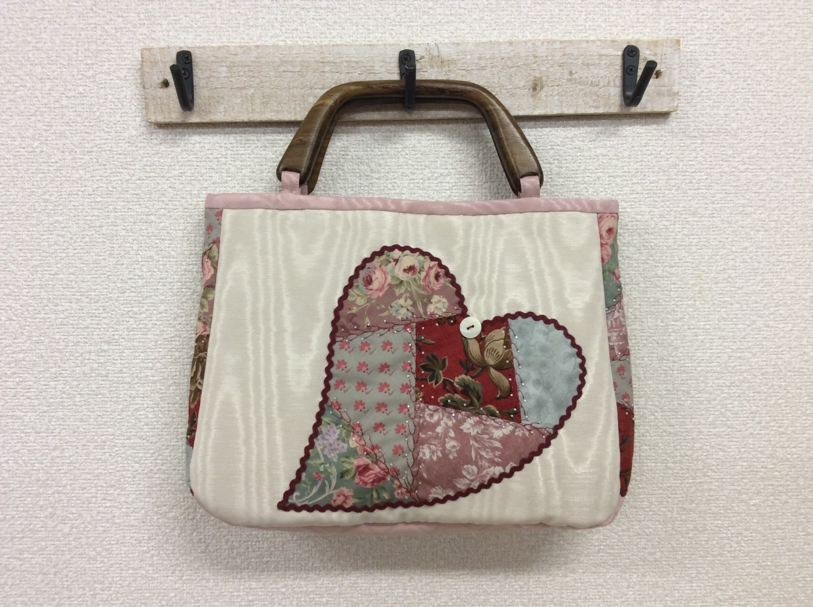 じゃばらテープに縁取られたクレイジーキルトのハートが印象的。マチの部分も簡単なクレイジーキルトです。土台布にはUSAのモアレを使用し、キルティングを省きます。