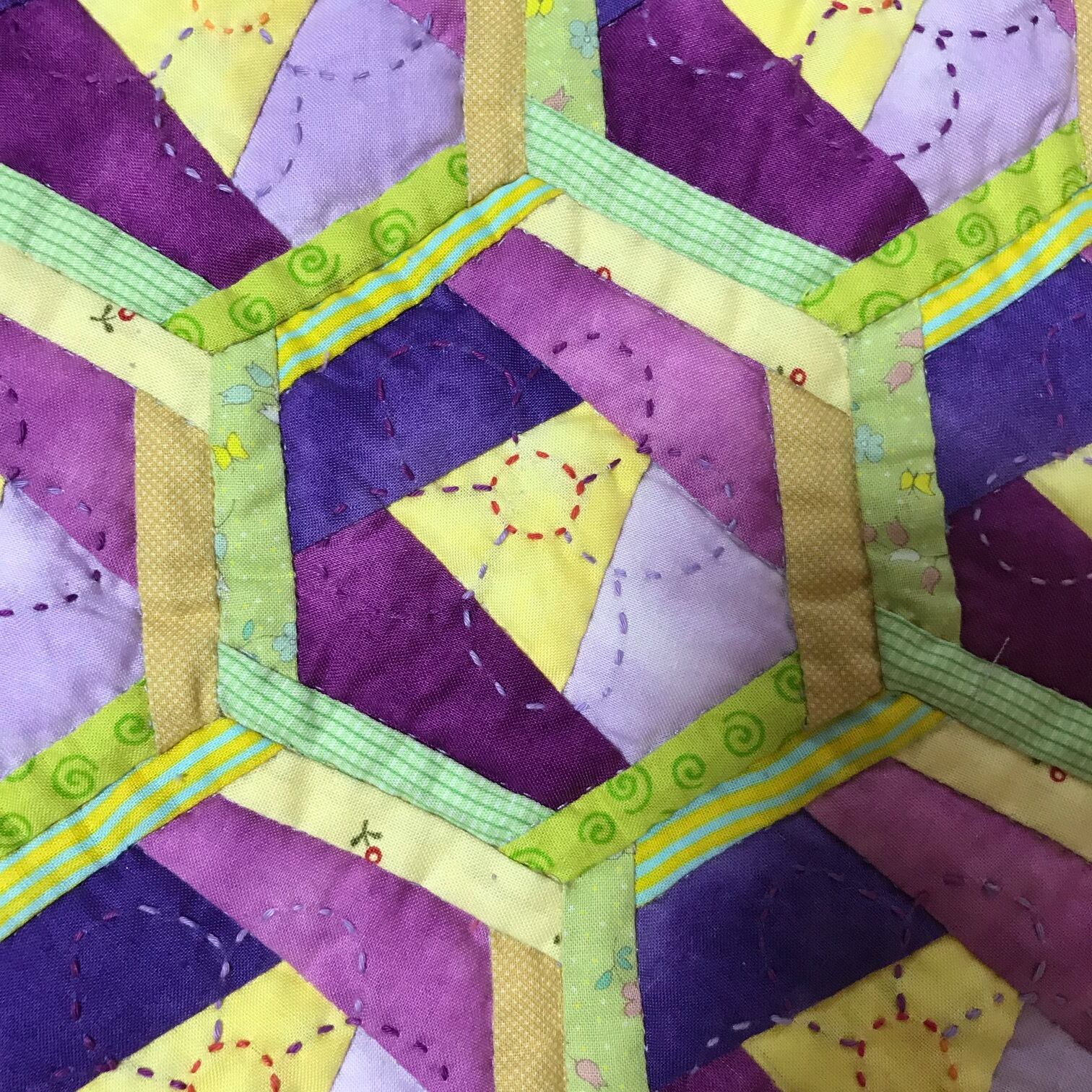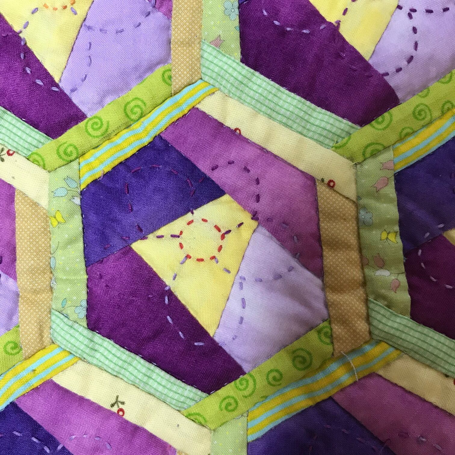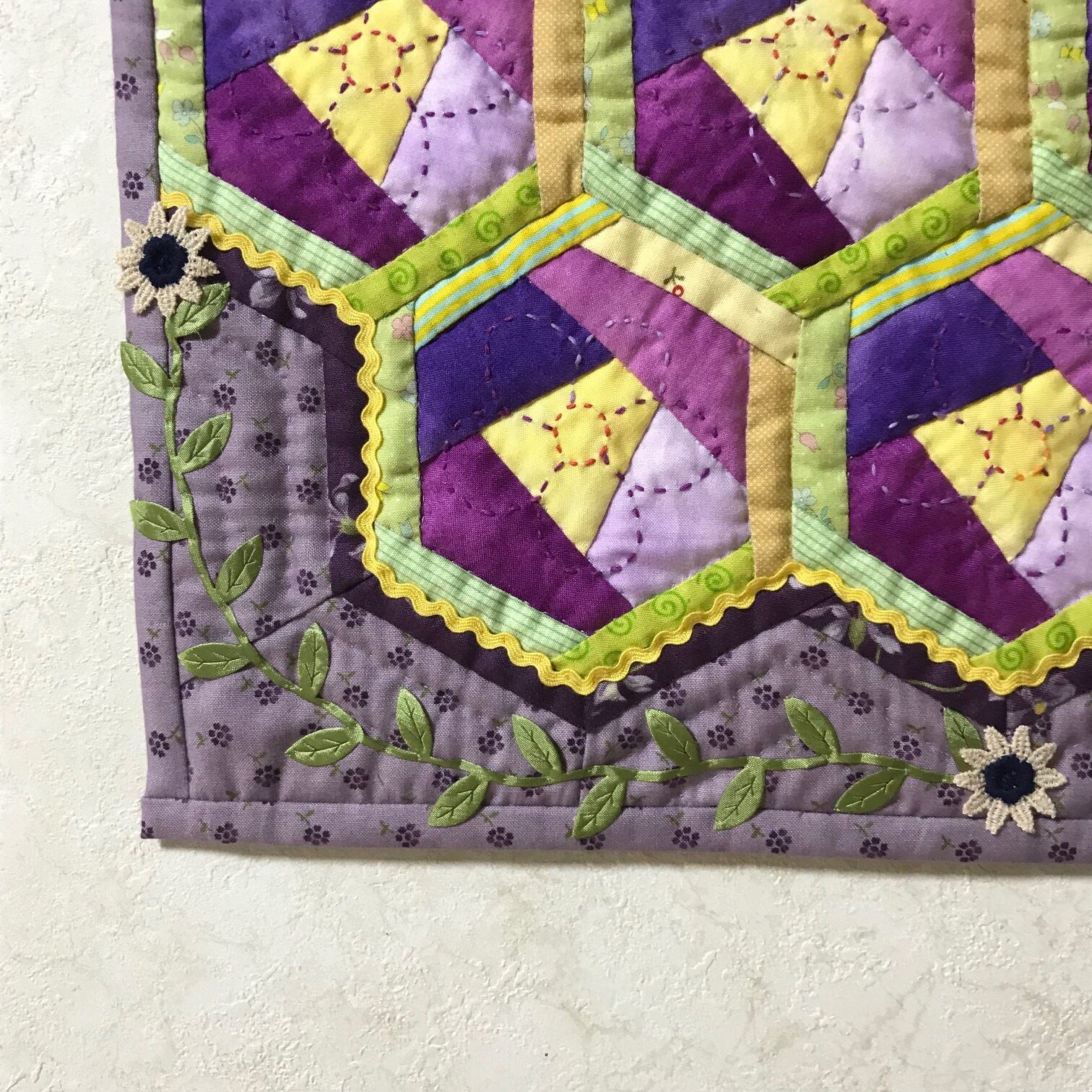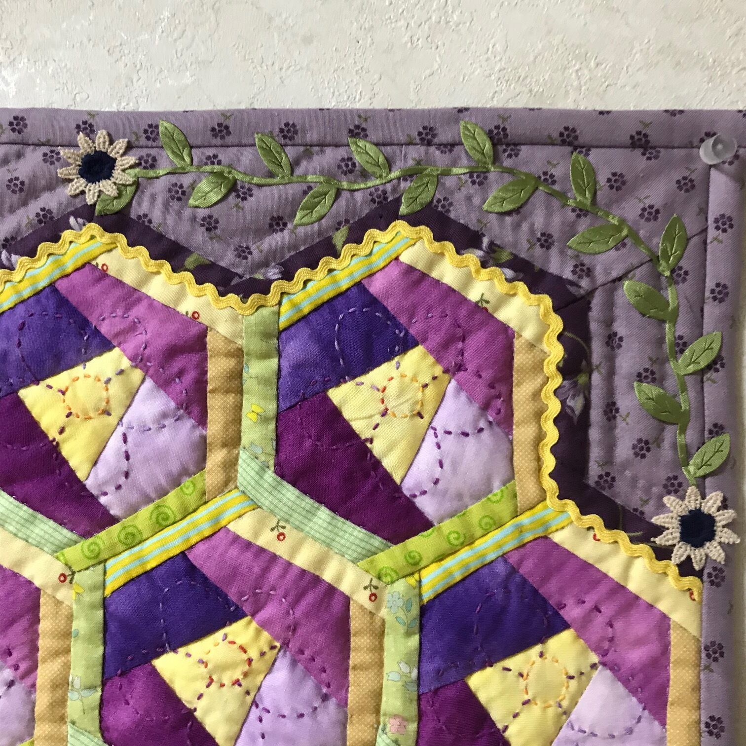 ムラ染めのクレイジーキルトにプリント布を合わせたヘキサゴンで、スミレを表現したタペストリー。美しいコントラストと調和を兼ね備えたモダンな配色です。