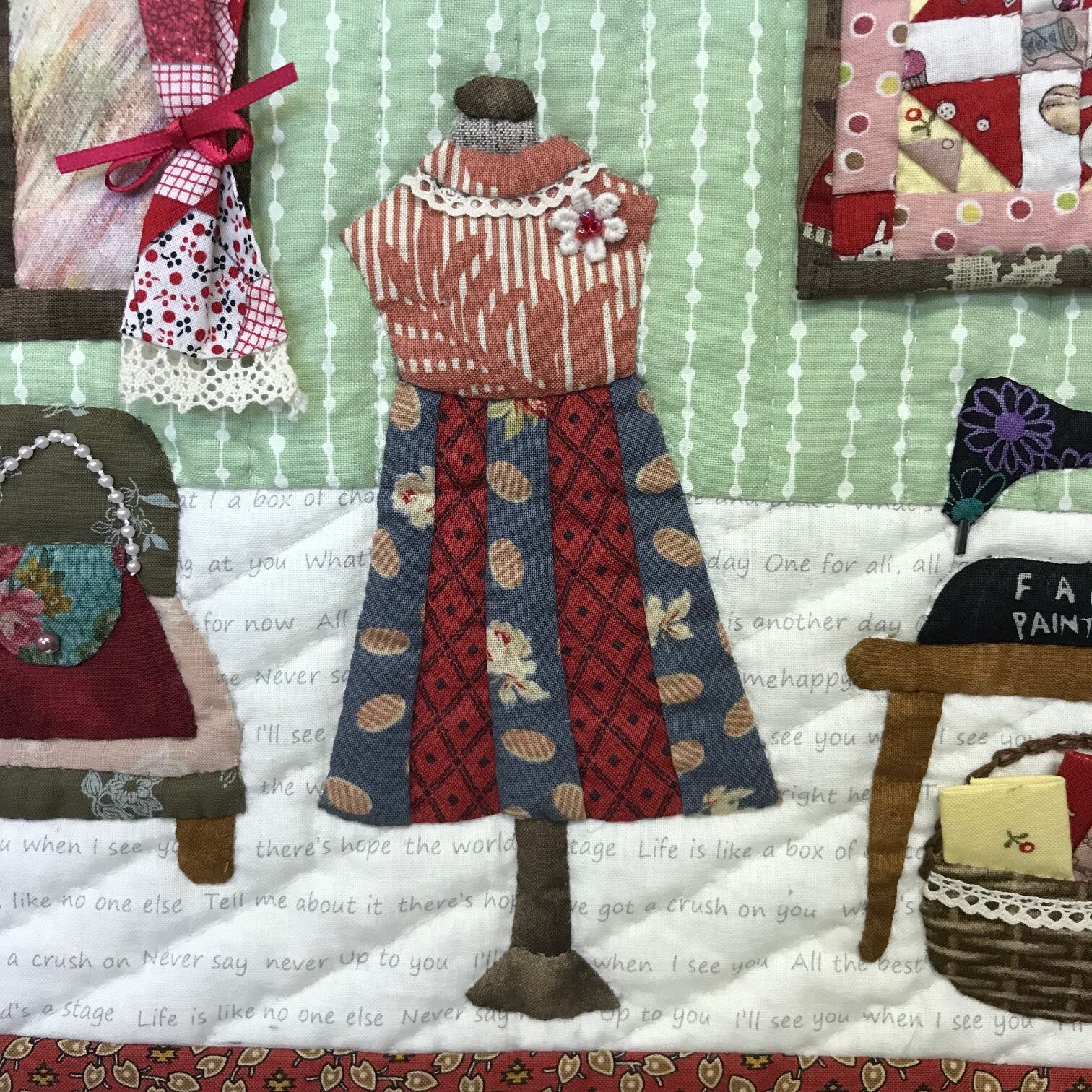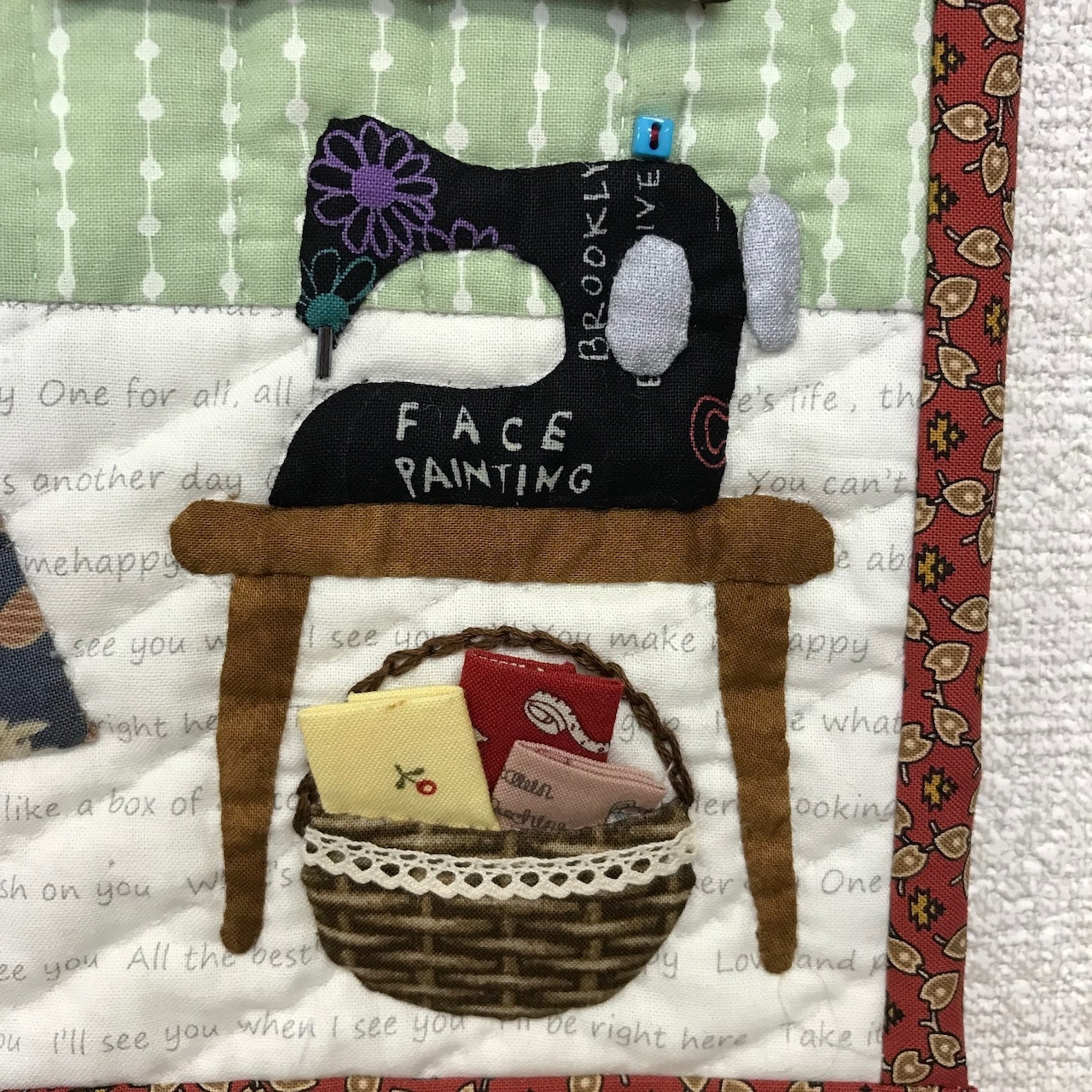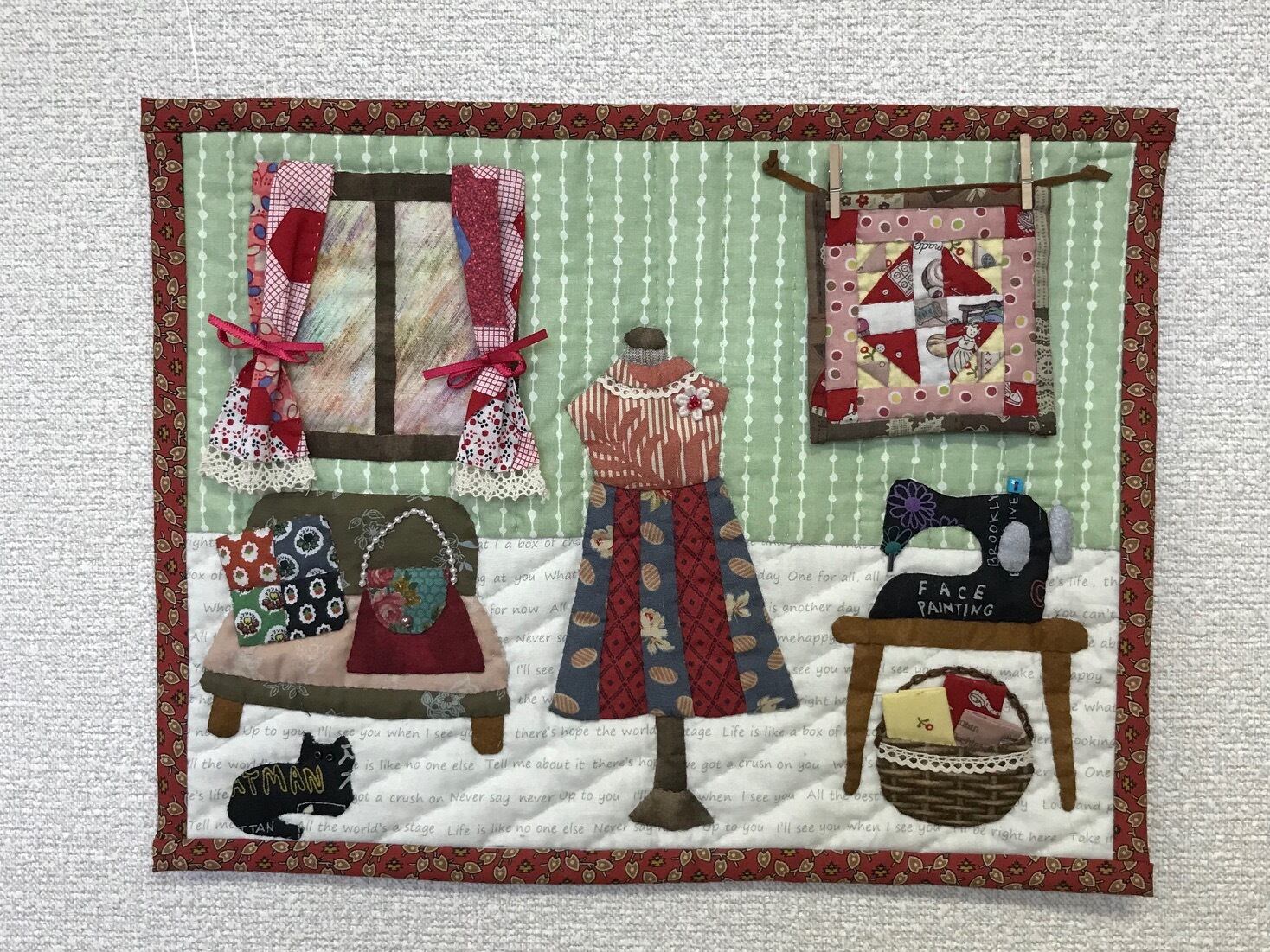 手作りが大好きな女の子のアトリエをイメージしたタペストリーです。バッグや洋服、ミシンなどを楽しみながらアップリケできます。