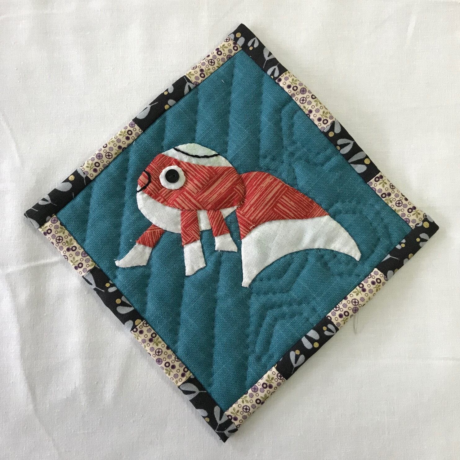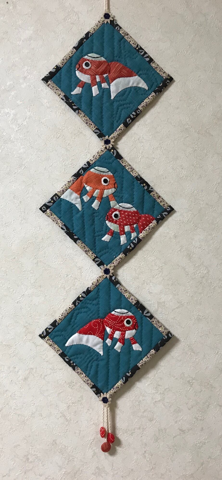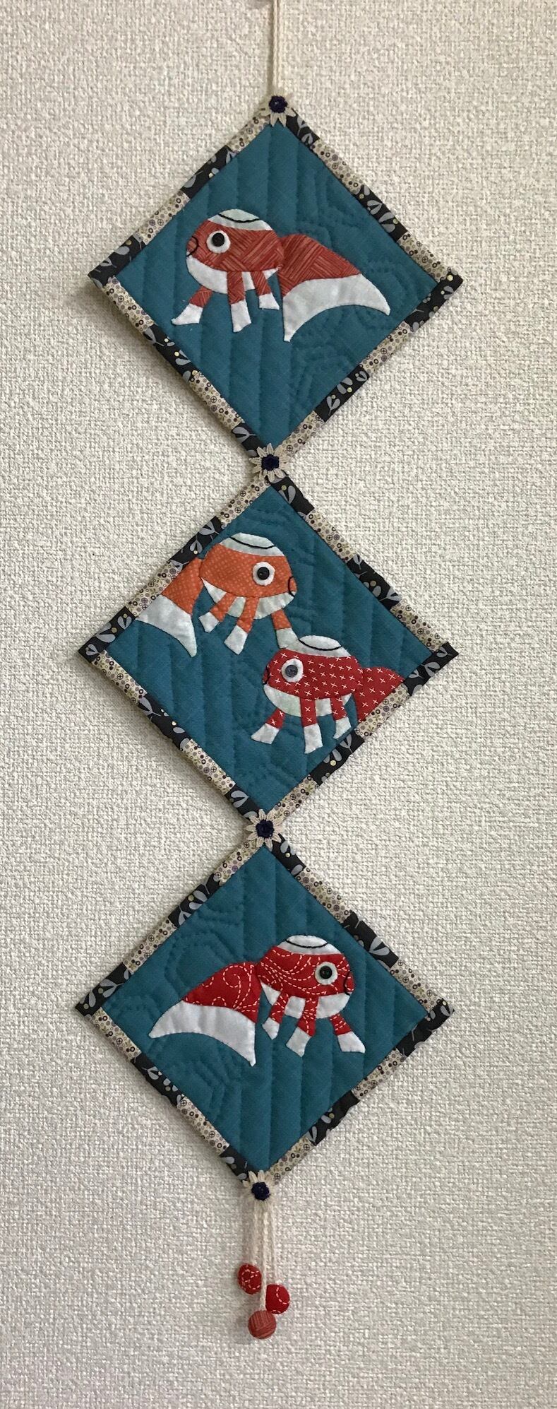 山口県柳井市の白壁の町並みに揺れる、金魚ちょうちんをアップリケしたタペストリー。パイピング布はなまこ壁をイメージした白黒です。