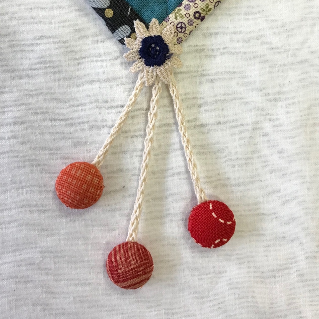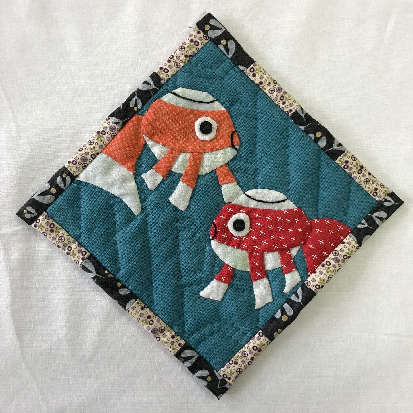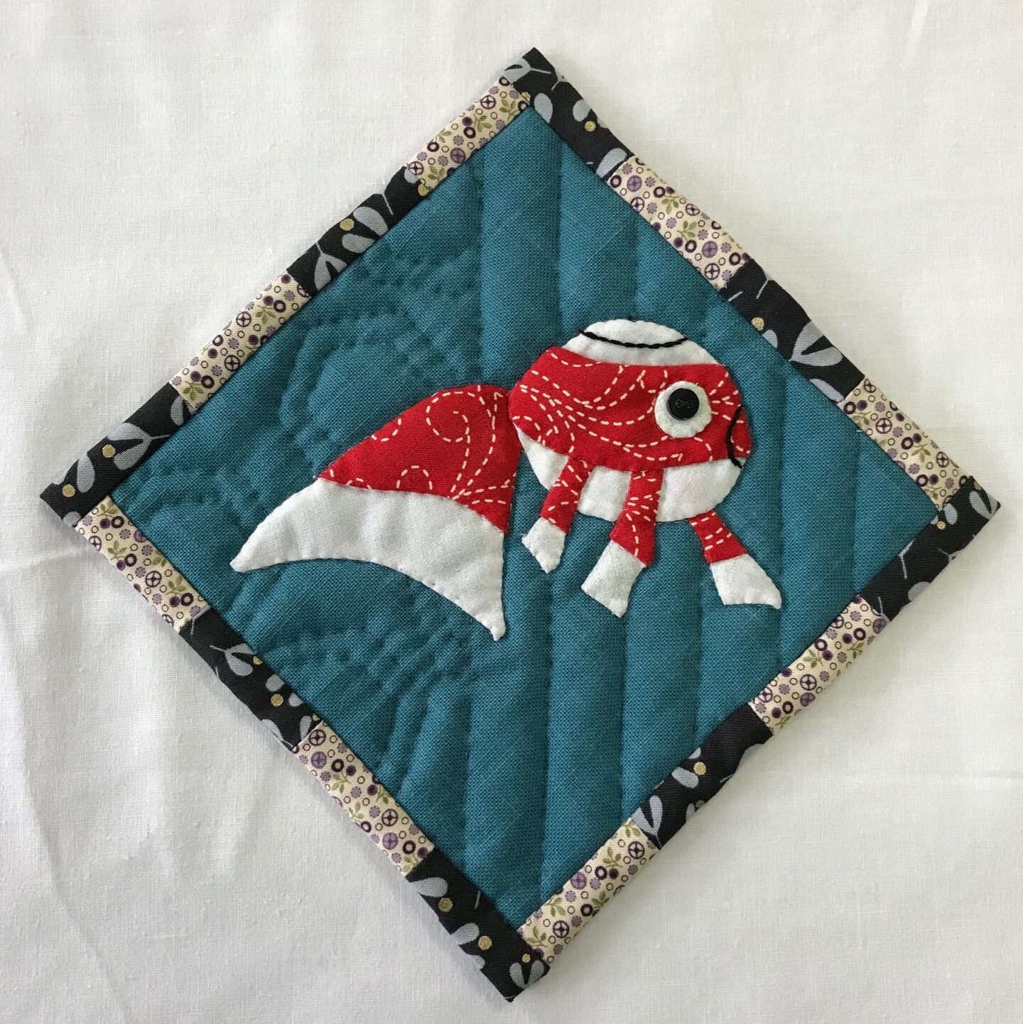 山口県柳井市の白壁の町並みに揺れる、金魚ちょうちんをアップリケしたタペストリー。パイピング布はなまこ壁をイメージした白黒です。
