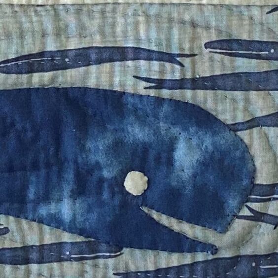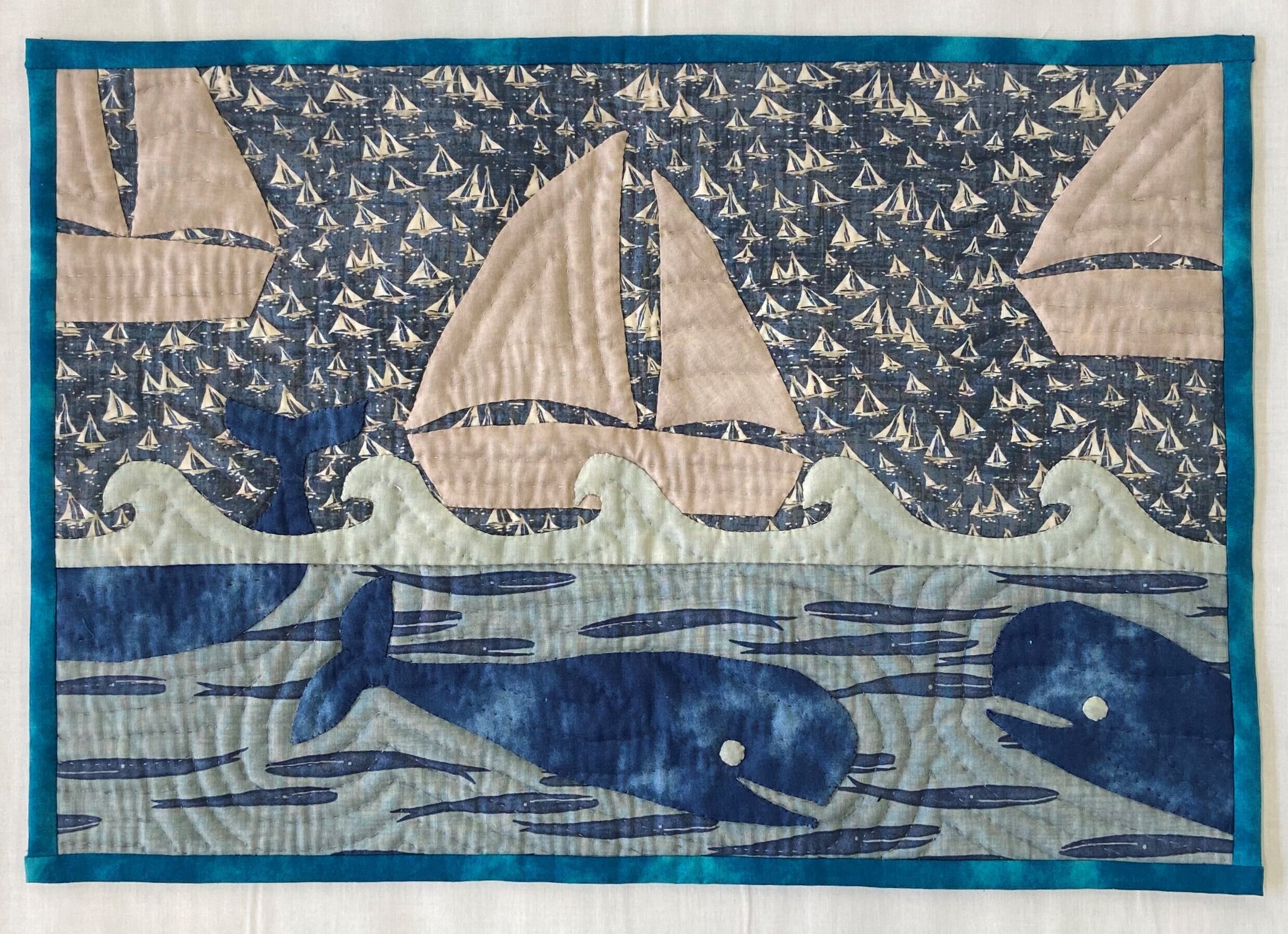 ヨットが行き交い、クジラが泳ぐ大海をデザインしたタペストリーです。布柄を生かし、落ち着いた色でまとめました。むら染めの布をアップリケに使います。