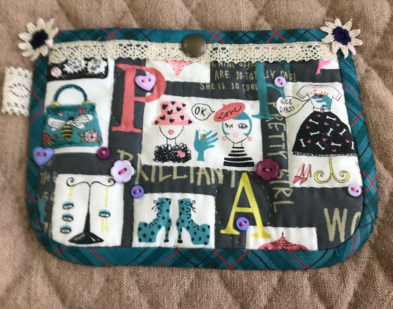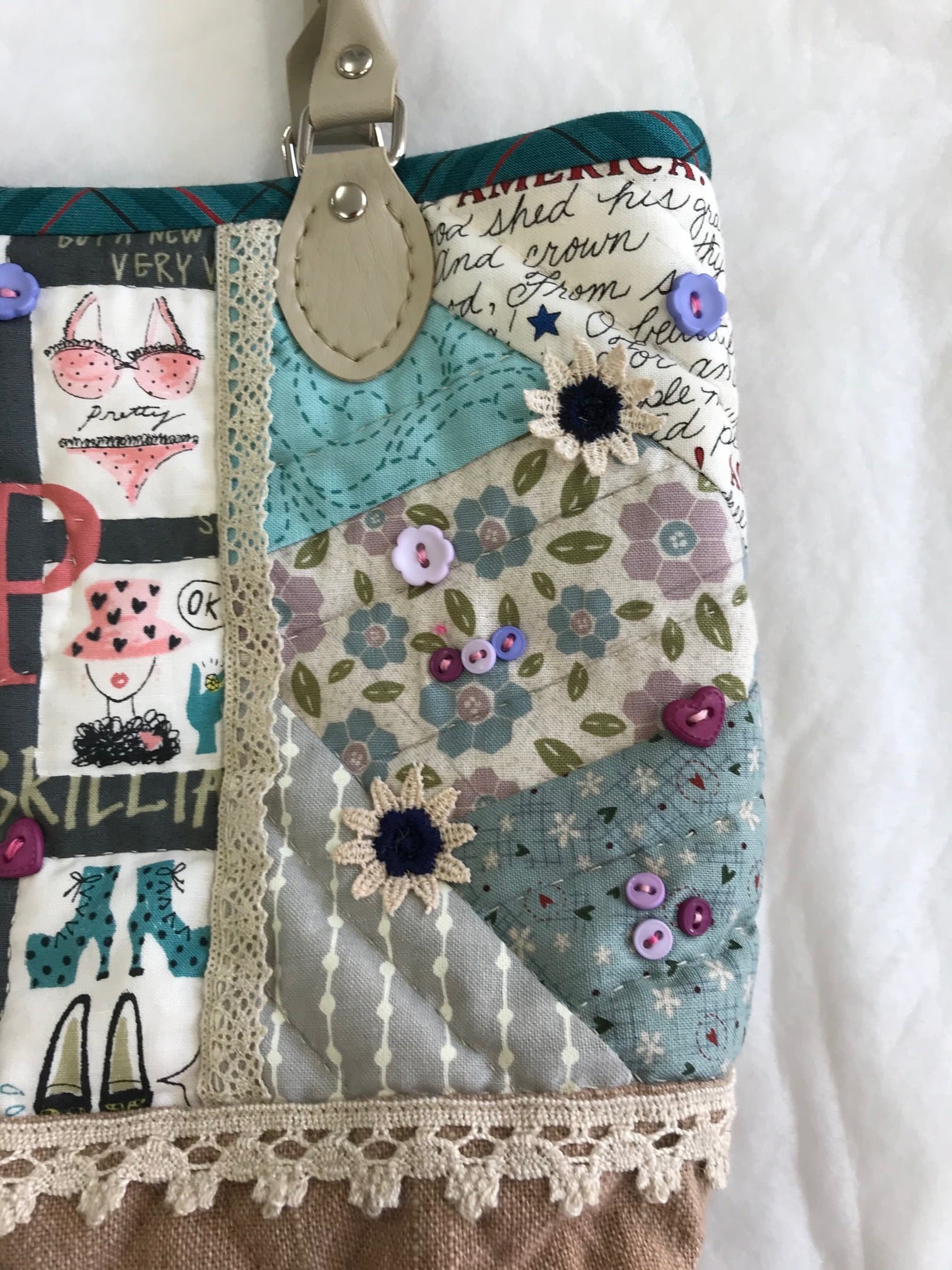 靴やバッグなど、おしゃれなアイテムをプリントした布に、クレイジーキルト風のパッチワークを合わせました。ボタンやレースを飾って、にぎやかな仕上がりに。後ろにはプリント柄を生かした大きなポケットを付けます。