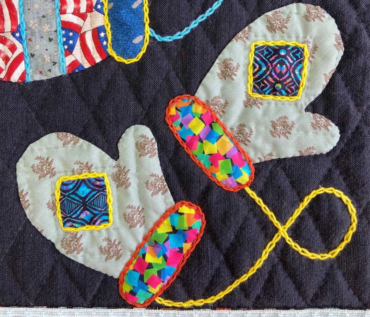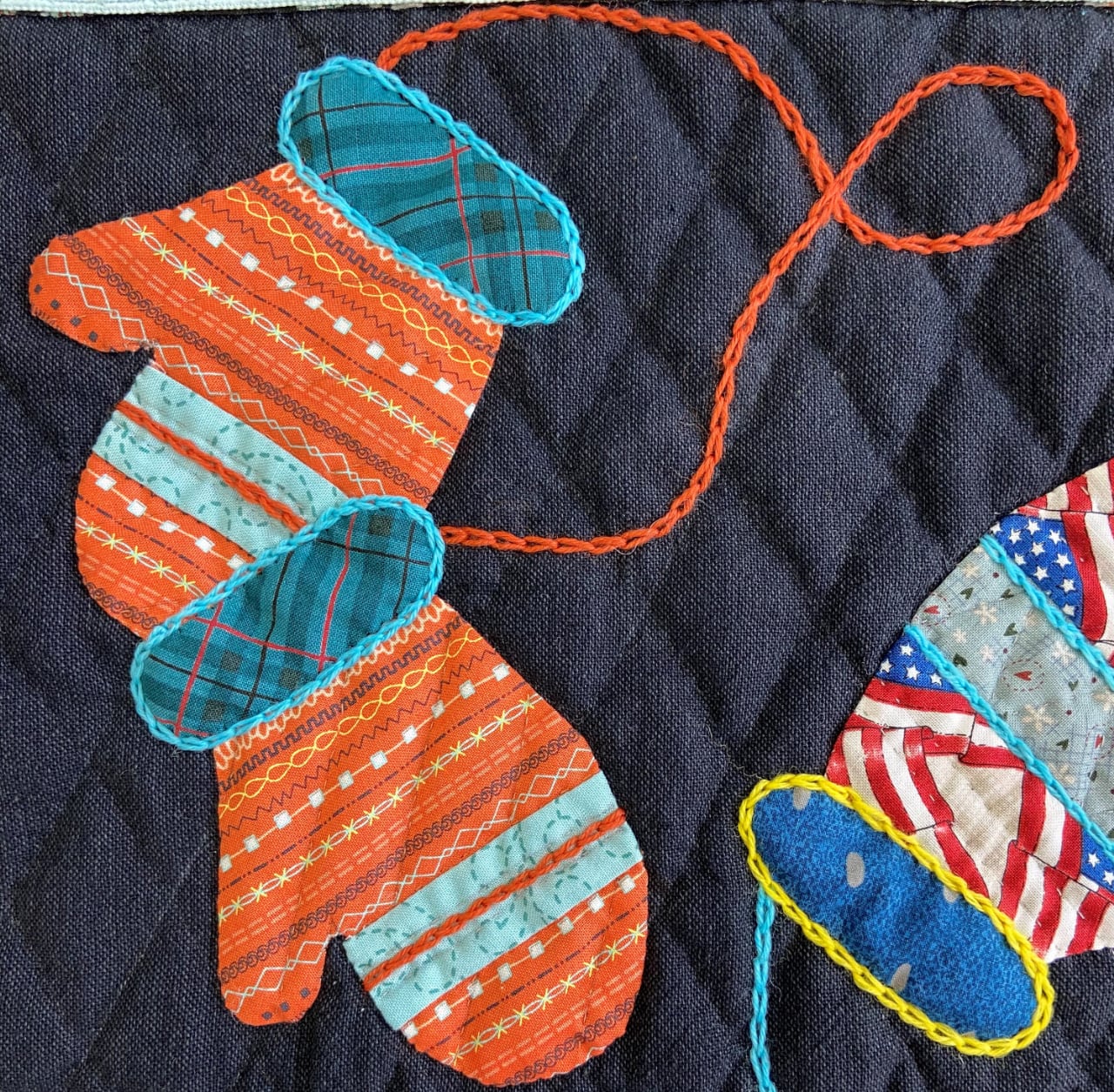 3組のミトンを大きくアップリケしたタペストリーです。上下にはアップリケに合わせた手袋柄のプリント。ミトンのひもや飾りのチェーンステッチに毛糸を使い、温かな印象に仕上げます。