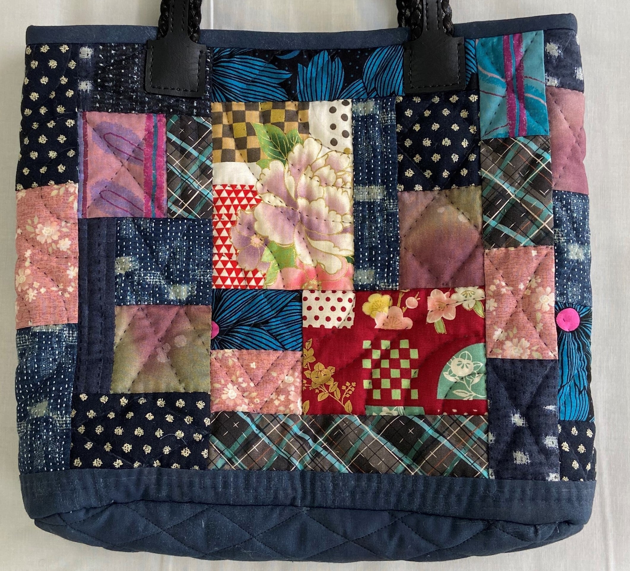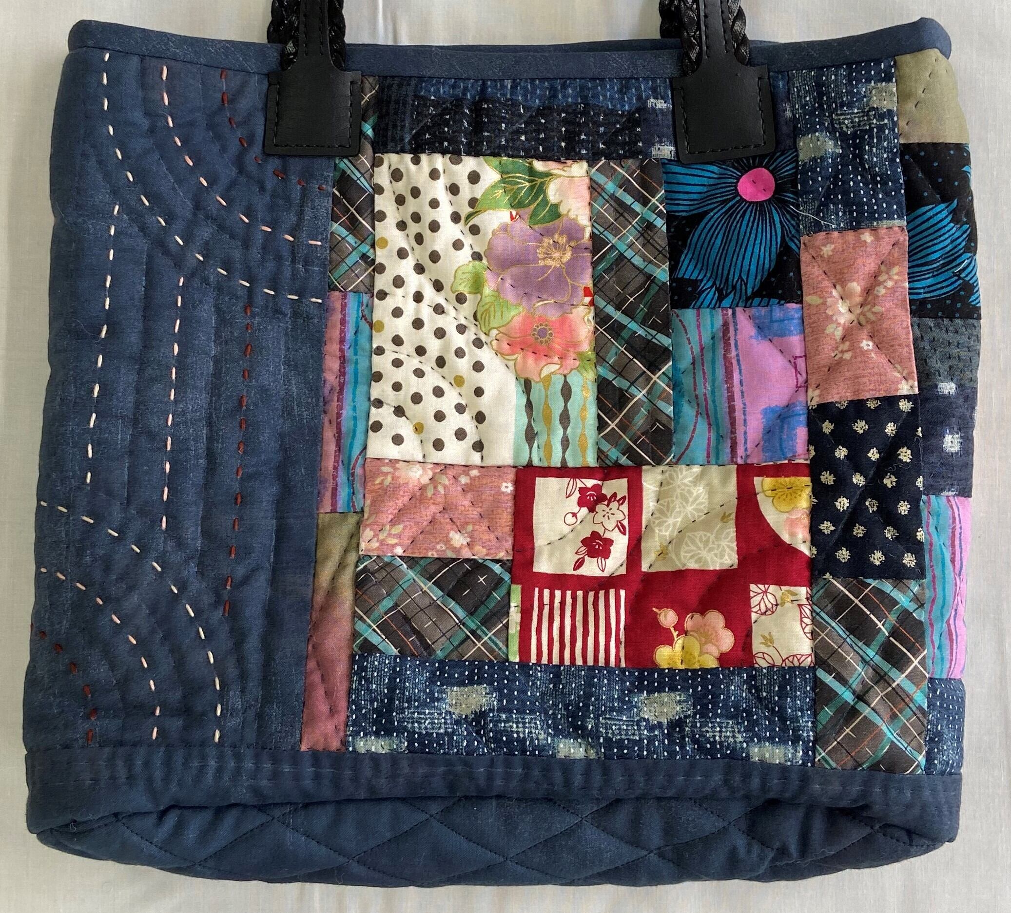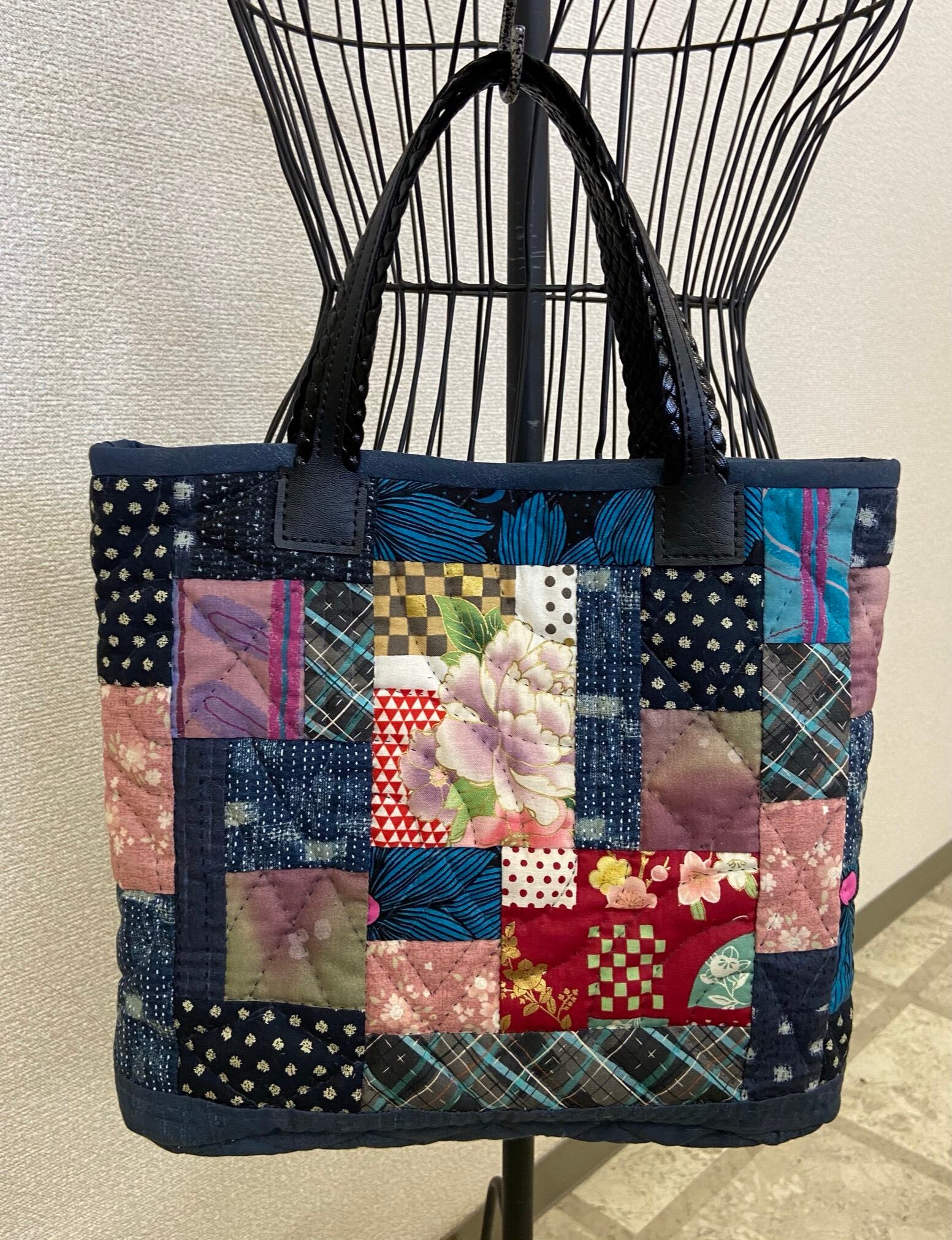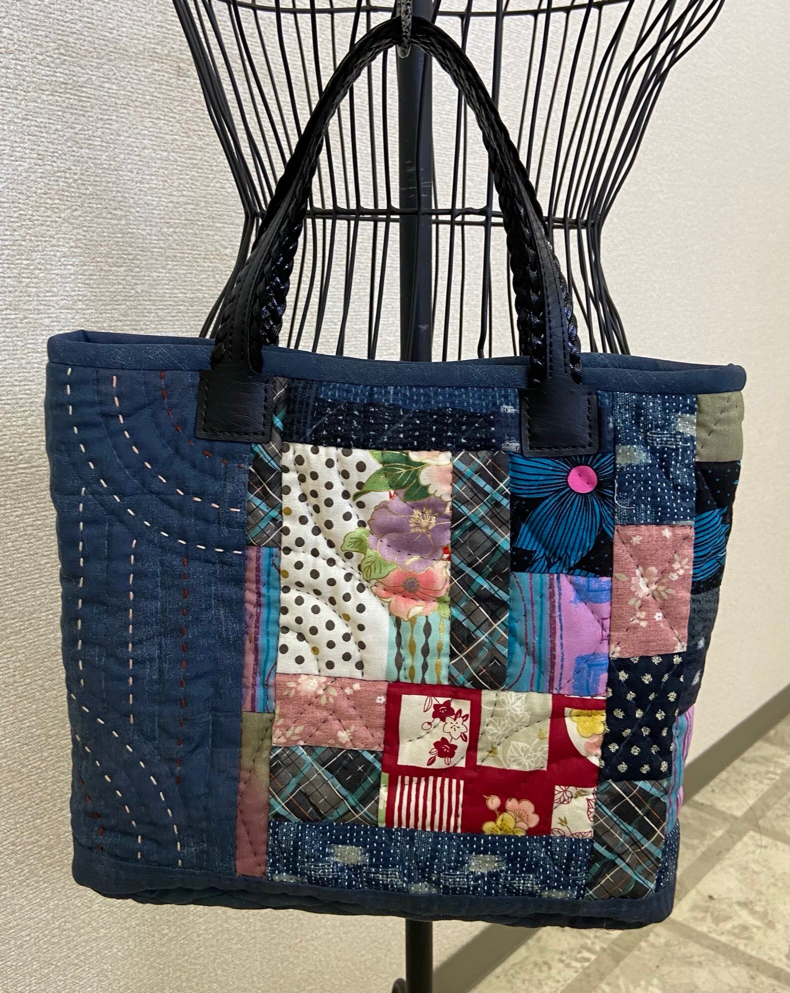 和洋どちらの装いにも合う、華やかなバッグです。藍色のベースに赤やピンクを交えたシンプルな長方形をピースワークしました。