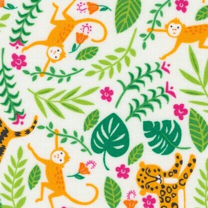 moda fabricsの『Jungle Paradise(ジャングルパラダイス)』というシリーズから、動物の表情がかわいいジャングルファンという名前のプリントです。